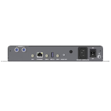 Reproductor/controlador LED asíncrono con carga 650 000 px (máx. 4096 × 4096), 2 × RJ45 Gigabit (1 primario + 1 respaldo), LAN Gigabit de gestión, Wi-Fi 2,4 GHz (AP/STA conmutables), USB 3.0 Tipo A y USB Tipo B, 2 conectores para sensores, audio estéreo 48 kHz. CPU ARM A55 1,8 GHz, 1 GB RAM, 32 GB internos; decodificación H.264/H.265/VP9 4K@60. Sincronización por NTP/GPS/RF. Alimentación 100–240 V~, 50/60 Hz, 0,6 A; consumo máx. 18 W. Dimensiones 274,3 × 139,0 × 40,0 mm; peso 1,23 kg; IP20; entorno −20 a +60 °C.