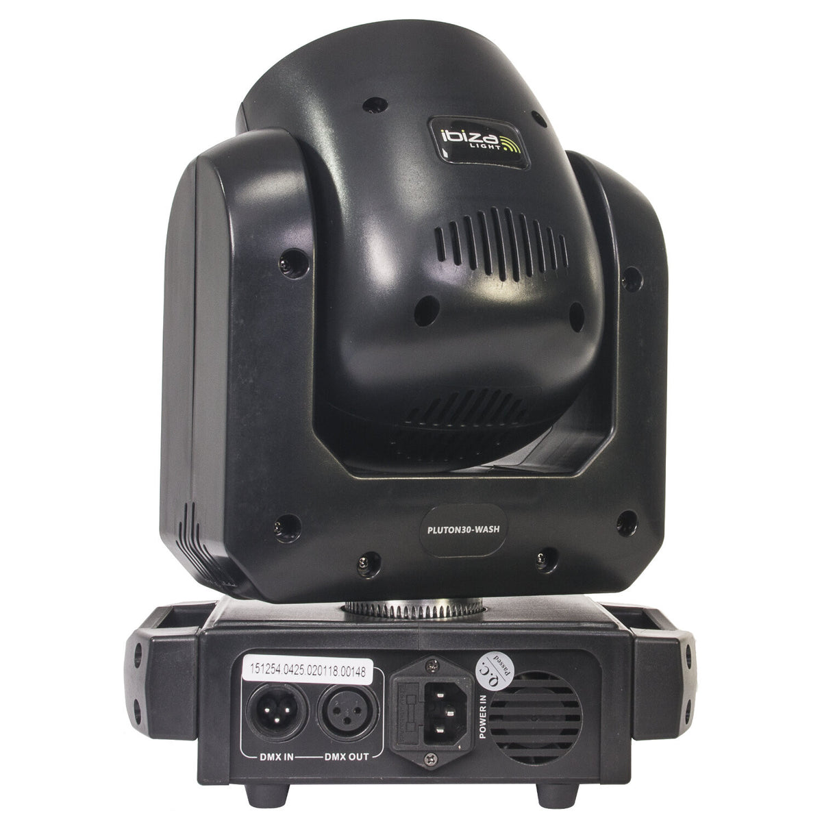 La PLUTON30-WASH ofrece una fuente spot de LED blanco de 30 W y una fuente wash de 6 LEDs de 12 W RGBWA-UV, dos ruedas intercambiables de color y gobo, pan/tilt de 540°/190° a dos velocidades, haz de 10°, dimmer lineal 0-100 %, estrobo 0-23 Hz, 4/20 canales DMX y memoria de posición. Sus dimensiones son 245 × 145 × 345 mm, peso 4,02 kg, alimentación 100-240 Vac 50/60 Hz y consumo 140 W.