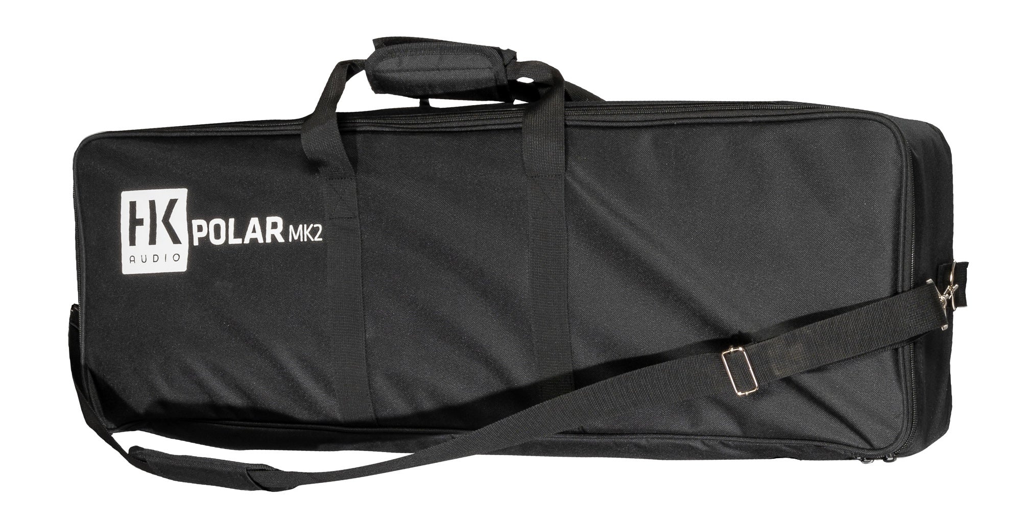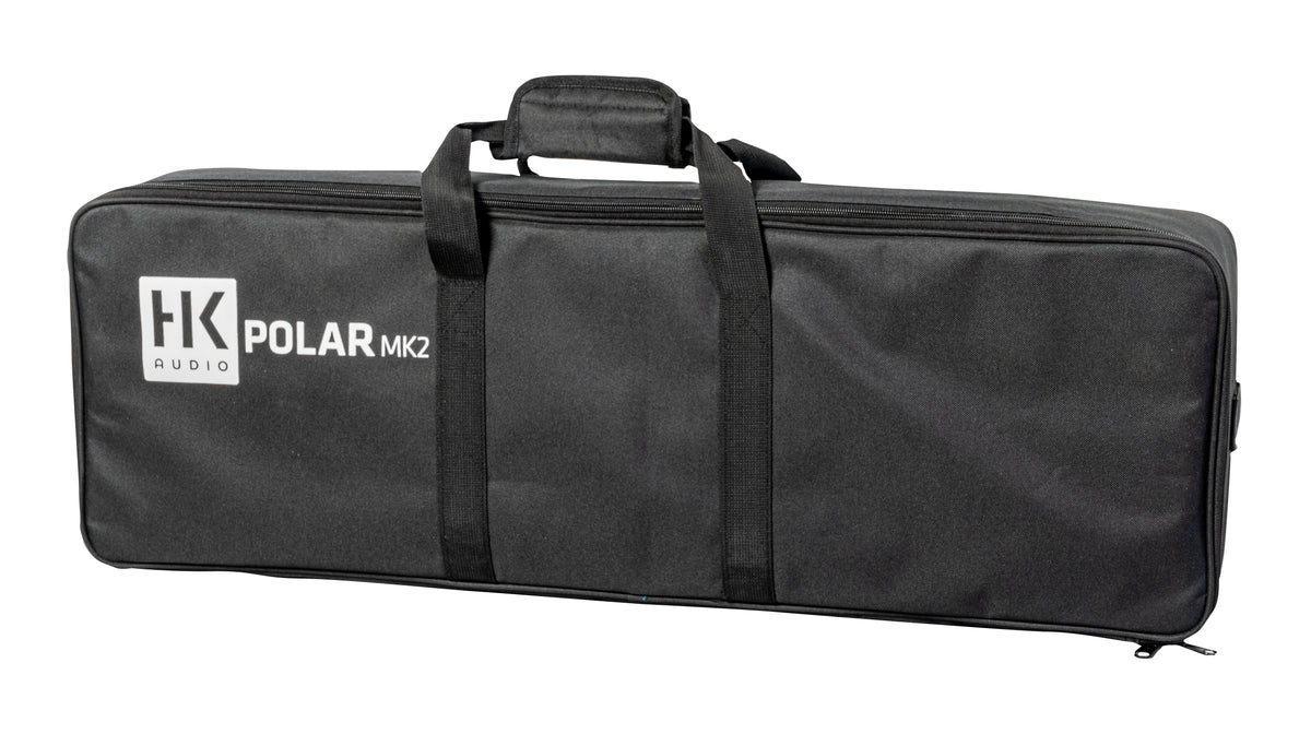 Bolsa de transporte acolchada para columnas HK Audio POLAR MK2 (compatible con POLAR 10 MK2 y POLAR 12 MK2); material: nylon reforzado; correa de hombro ajustable y asa ergonómica; cremallera robusta; separador interior; color negro con logotipo blanco.