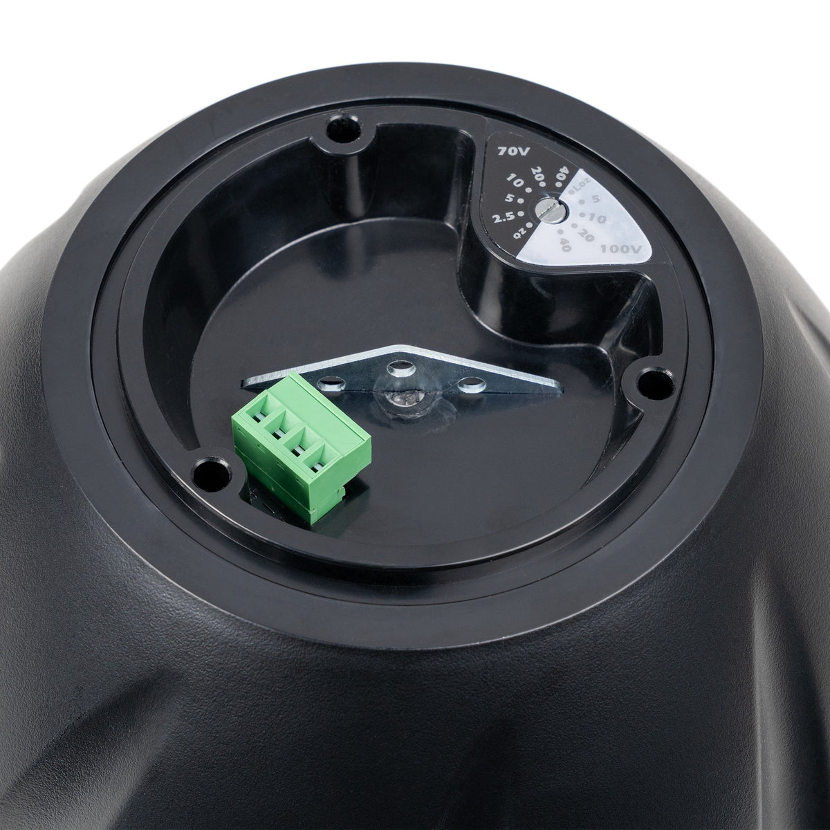 Altavoz colgante pasivo de 2 vías con un woofer de 6.5 pulgadas de polipropileno y un tweeter de cúpula de Mylar de 1 pulgada. Ofrece una potencia RMS de 40W y es compatible con sistemas de baja impedancia a 8 Ohms y líneas de voltaje constante de 70V y 100V. Dispone de un selector para tomas de potencia en 100V (5W, 10W, 20W, 40W) y 70V (2.5W, 5W, 10W, 20W, 40W). Su respuesta en frecuencia abarca desde 70Hz hasta 20.000Hz, con una sensibilidad de 90dB (SPL @ 1W/1m). La carcasa está construida en ABS reforzado con fibra de vidrio, cuenta con una rejilla de acero magnética, doble puerto bass reflex frontal, y tiene unas dimensiones de Ø252 x 240 mm con un peso de 2.64 kg.