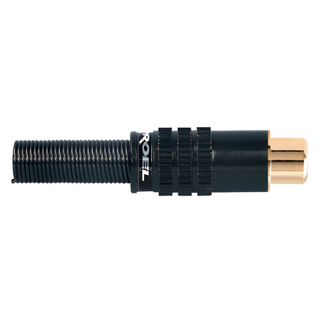 Conector de audio tipo RCA hembra aéreo (inline) para montaje en cable. Construcción con carcasa de aluminio negro y contactos chapados en oro para baja resistencia de contacto. Incorpora sistema de alivio de tensión mediante muelle flexible de acero para protección mecánica del cableado en la entrada. Admite cables con diámetro exterior de hasta 8 mm. Terminación mediante soldadura. Color de identificación: Negro.