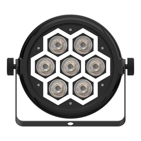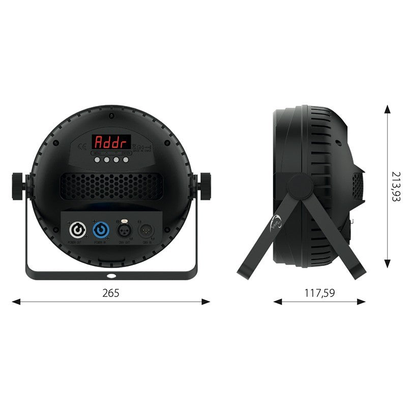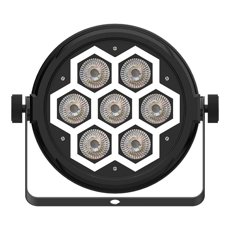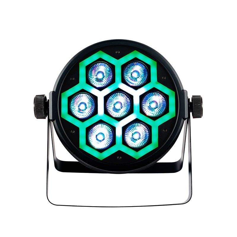 PAR LED IP20 con 7 × 12 W RGBW (haz 26°) + anillo 60 × 0,2 W RGB SMD tipo neón; 27.130 lux @1 m (full color), dimmer 0–100 %, estrobo hasta 25 f/s, CTB/CTO 2.800–8.000 K. Control DMX-512 con 12/17 canales, modos autónomo/maestro-esclavo/sonido y mando RF. Alimentación AC 100–240 V 50/60 Hz, 80 W máx. Dimensiones 280 × 245 × 150 mm, peso 2,2 kg, chasis de ABS, refrigeración pasiva, protección contra sobrecalentamiento.