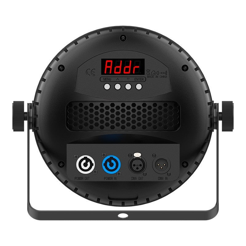 El cuerpo de ABS ignífugo y resistente a la corrosión mantiene un peso muy contenido (2,2 kg), ideal para rental y montajes ágiles. La conectividad permite enlace en cadena: PowerCON (IN/OUT) para alimentación y XLR de 3 pines (IN/OUT) para señal. Puede trabajar en autónomo con programas integrados, maestro/esclavo, activación por sonido o mediante DMX-512 con 12 o 17 canales seleccionables. Incluye mando a distancia RF y display LED de 4 dígitos con 4 botones para una configuración directa.