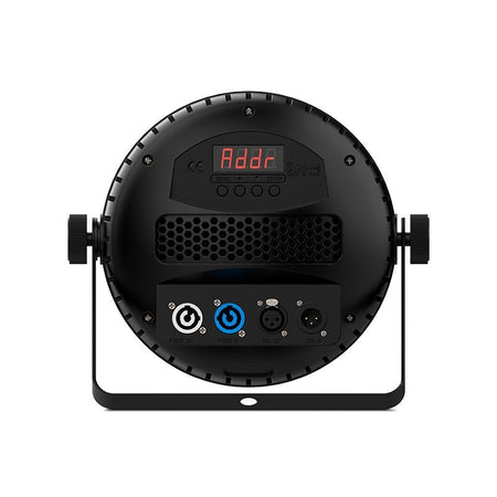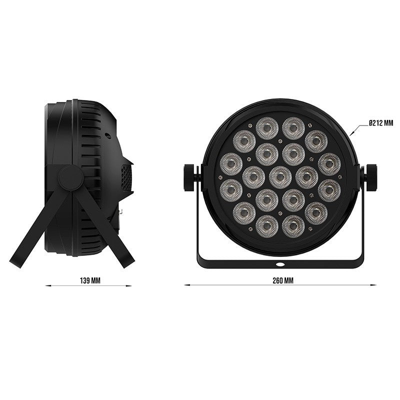 PAR LED IP20 con 19 × 12 W RGBWA+UV (6 en 1), haz 26°, 25.300 lux @1 m (full color), dimmer 0–100 %, estrobo hasta 25 f/s, CTB/CTO 2.800–8.000 K, control por píxel y programas integrados. Señal DMX con 12/30 canales, modos autónomo/maestro-esclavo/sonido. PowerCON 16 A IN/OUT y XLR 3 pines IN/OUT. Alimentación AC 90–260 V 50/60 Hz, 250 W máx. Medidas 265 × 213 × 117 mm, peso 2,2 kg, carcasa de ABS, enfriamiento pasivo, rango térmico −35 a +45 °C.