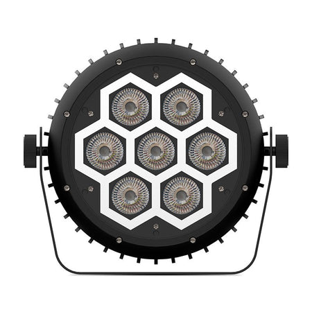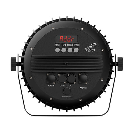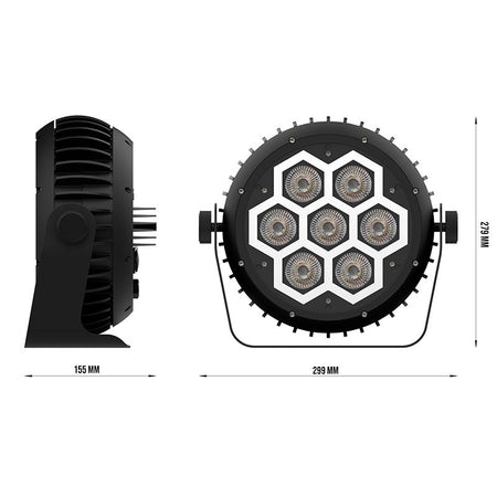 PAR Wash IP65 con 7×12 W RGBW (haz 26°) y anillo 60×0,2 W RGB SMD tipo neón; 10.635 lux @1 m (full color), dimmer 0–100 %, estrobo hasta 25 f/s, CTB/CTO 2.800–8.000 K. Control DMX-512 12/17 canales, modos autónomo/maestro-esclavo/sonido y mando. Conectores PowerCON TRUE1 REAN (IN/OUT, IP65, EN 60320-1) y XLR 3 pines REAN (IN/OUT, IP65). Alimentación AC 100–240 V 50/60 Hz, consumo 120 W; protección contra sobrecalentamiento; rango térmico −15 a +45 °C. Dimensiones 380 × 230 × 335 mm, peso 5,5 kg, chasis de aluminio.