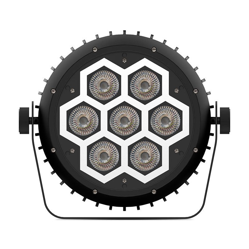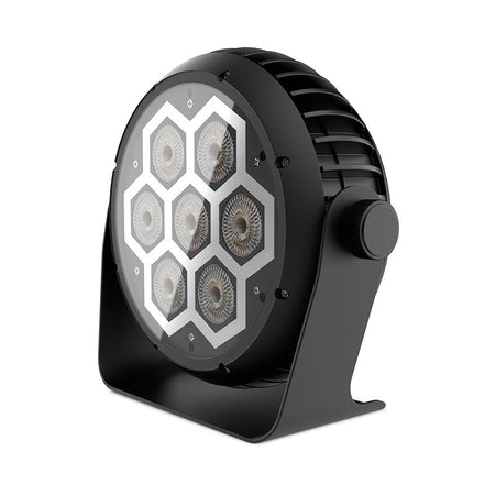 - Fuente de luz doble: 7×12 W RGBW (haz principal) + 60×0,2 W RGB SMD (efecto neón).