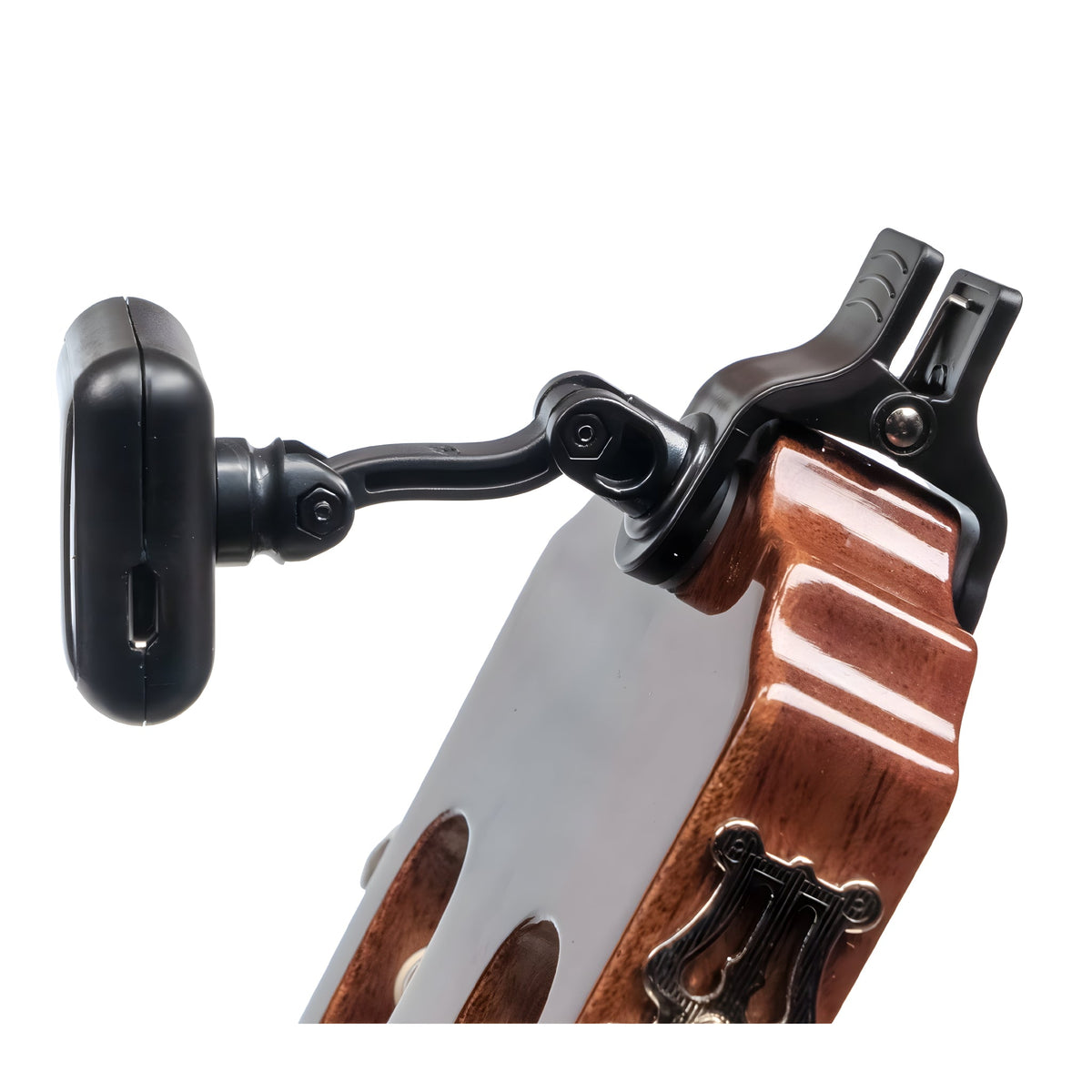 Afinador digital de pinza con funcionamiento recargable. Dispone de un sistema de detección de afinación por vibración y múltiples modos operativos: cromático, bajo, ukelele y violín. Está equipado con una pantalla LCD a color y un diseño de pinza con capacidad de rotación de 360 grados. Incluye cable USB para la recarga de su batería interna.