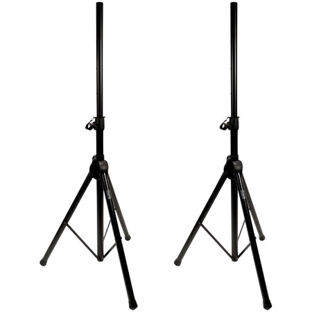 Set de dos soportes para altavoz tipo PA modelo QSS001ST. Fabricación en aluminio con diseño de trípode. Altura ajustable en un rango de 1350 mm a 2000 mm. Diámetro de la base de 1320 mm. Capacidad de carga individual de 35 kg. Peso por unidad de 3,5 kg. Incluye bolsa de transporte fabricada en nylon 210D para dos unidades.
