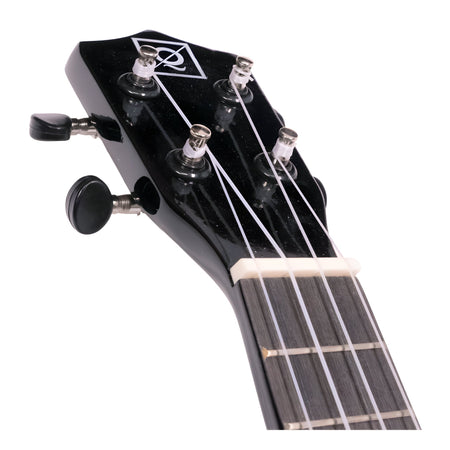 Ukelele soprano OQAN modelo QUK-1 BK. Cuerpo fabricado en madera de tilo con acabado en color negro brillante. Mástil con diapasón de madera de palisandro de 12 trastes. Puente de palisandro. Clavijeros de afinación cromados, fundidos a presión (die-cast). Equipado con cuerdas Aquila. Incluye funda de transporte.
