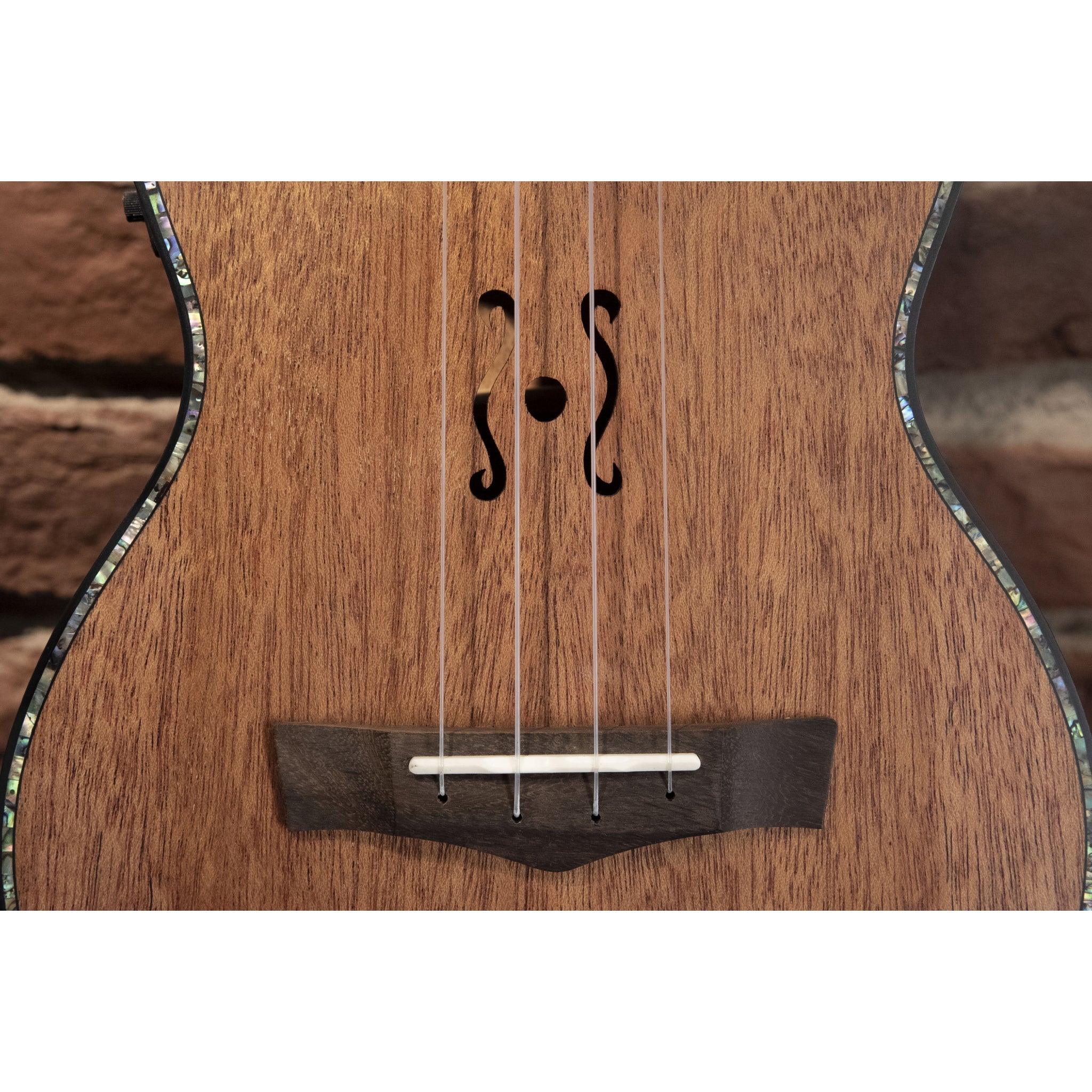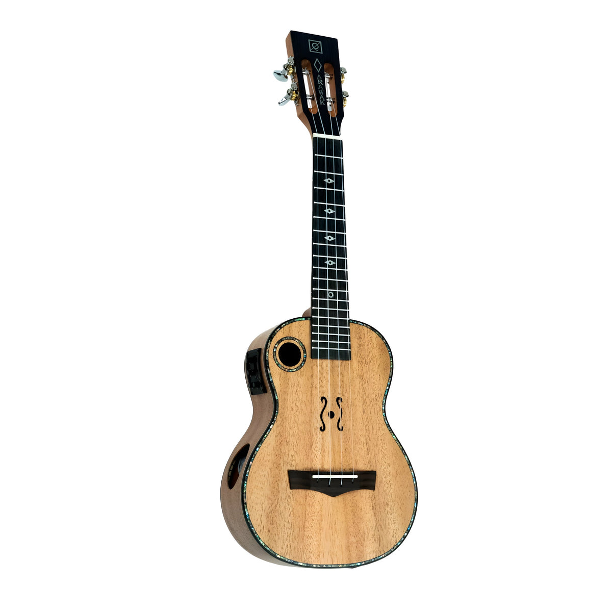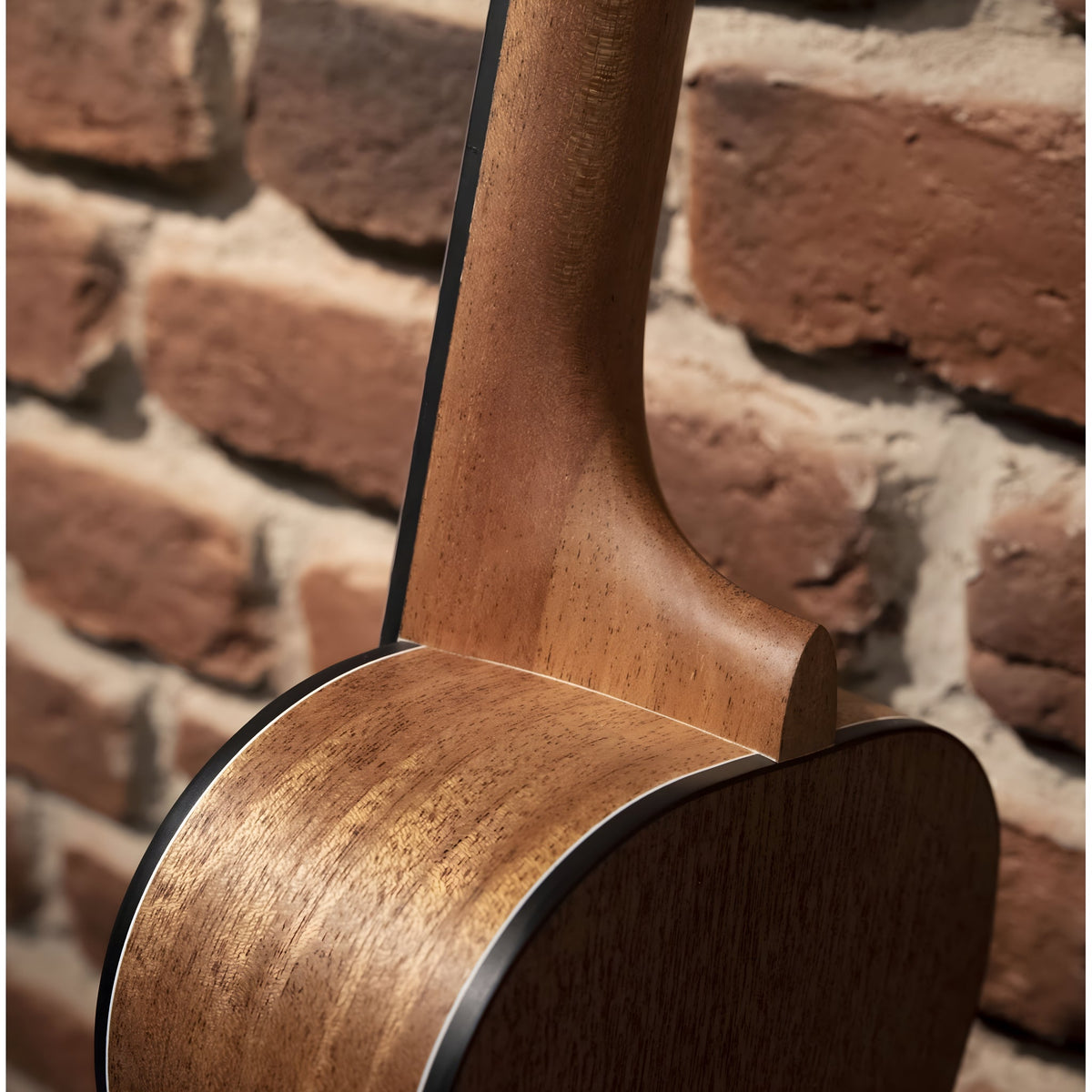 Ukelele de concierto electroacústico. Cuerpo, aros y fondo construidos en caoba sólida. Mástil de caoba con diapasón de palisandro compuesto ("compound rosewood"). Longitud de escala aproximada de 38 cm. Incorpora dos salidas de sonido, una frontal y otra lateral en el aro. Clavijeros abiertos tipo "Die-Cast". Sistema de preamplificación con afinador cromático integrado, control de volumen y tono. Binding corporal de acabado nacarado. Acabado general del instrumento en color natural mate.
