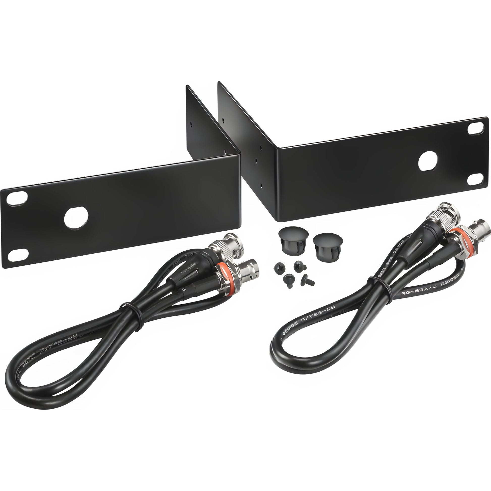 Los latiguillos suministrados son RG-58 de 50 Ω y se atornillan en la oreja frontal para crear un paso de antena seguro; por detrás, se conectan a los BNC del receptor. El kit también aporta tapones de plástico para anular los orificios de antena si no se usan. Todo el conjunto está optimizado para un montaje rápido y limpio en 1U, usando la tornillería incluida, y admite tanto las antenas de 1/2 onda del receptor como la conexión de extensiones coaxiales hacia antenas remotas.