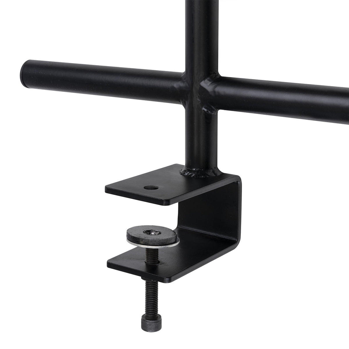 La instalación es uno de sus puntos fuertes, gracias a los dos conectores de apriete manual integrados que permiten una fijación rápida y sin complicaciones directamente al perfil de la tarima Riser D750. Además, su diseño modular incorpora un sistema de conexión de dos puntos que permite unir varias barandillas entre sí, creando una barrera continua y extremadamente estable en todo el perímetro del escenario.