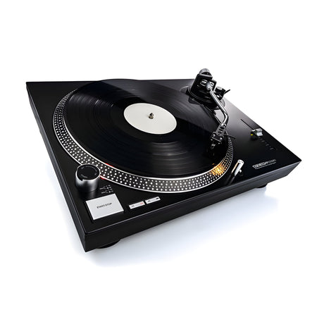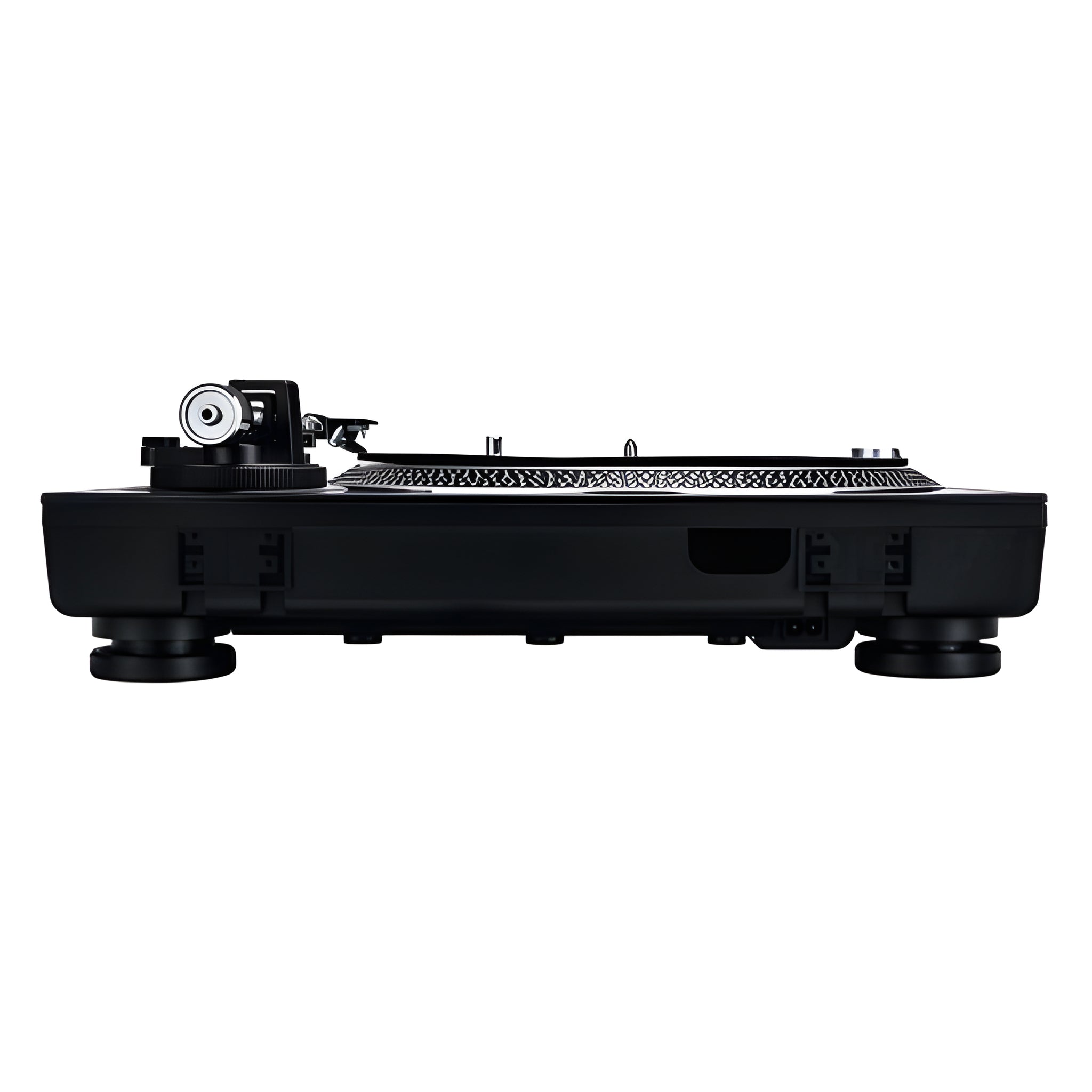 Su motor brushless de 8 polos y 2 fases transfiere la fuerza directamente al eje, logrando par de arranque > 1 kg·cm, arranque/cambio de rpm < 1 s y freno electrónico (< 1 s), con estabilidad de giro y wow & flutter < 0,15 % WRMS. Para la mezcla y el beatmatching dispone de pitch ±8 %. El brazo en S estáticamente equilibrado incluye elevación hidráulica y anti-skating, con conexión universal tipo SME para montar una amplia variedad de cápsulas.