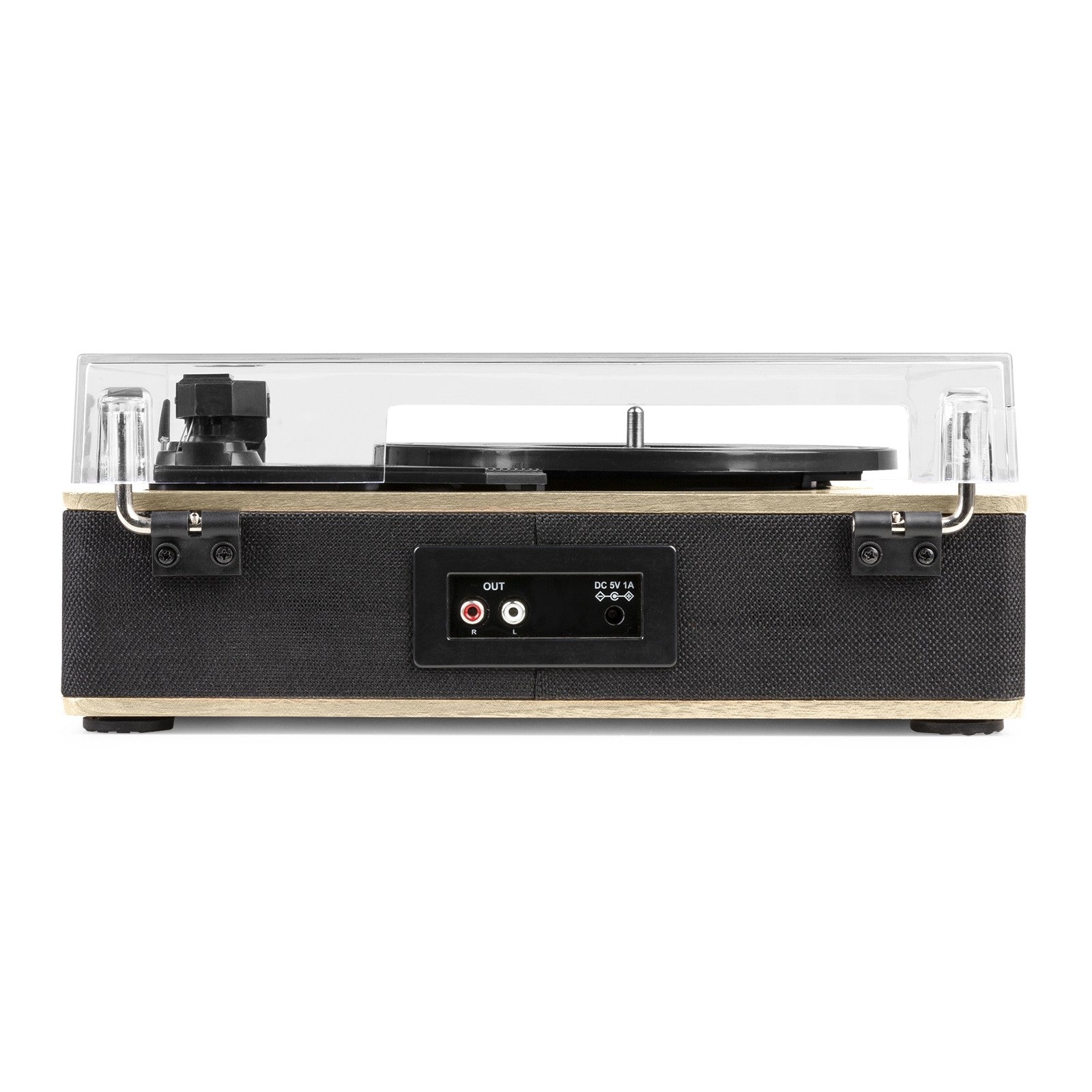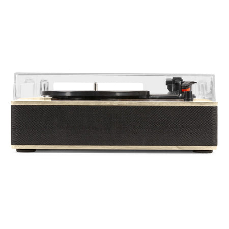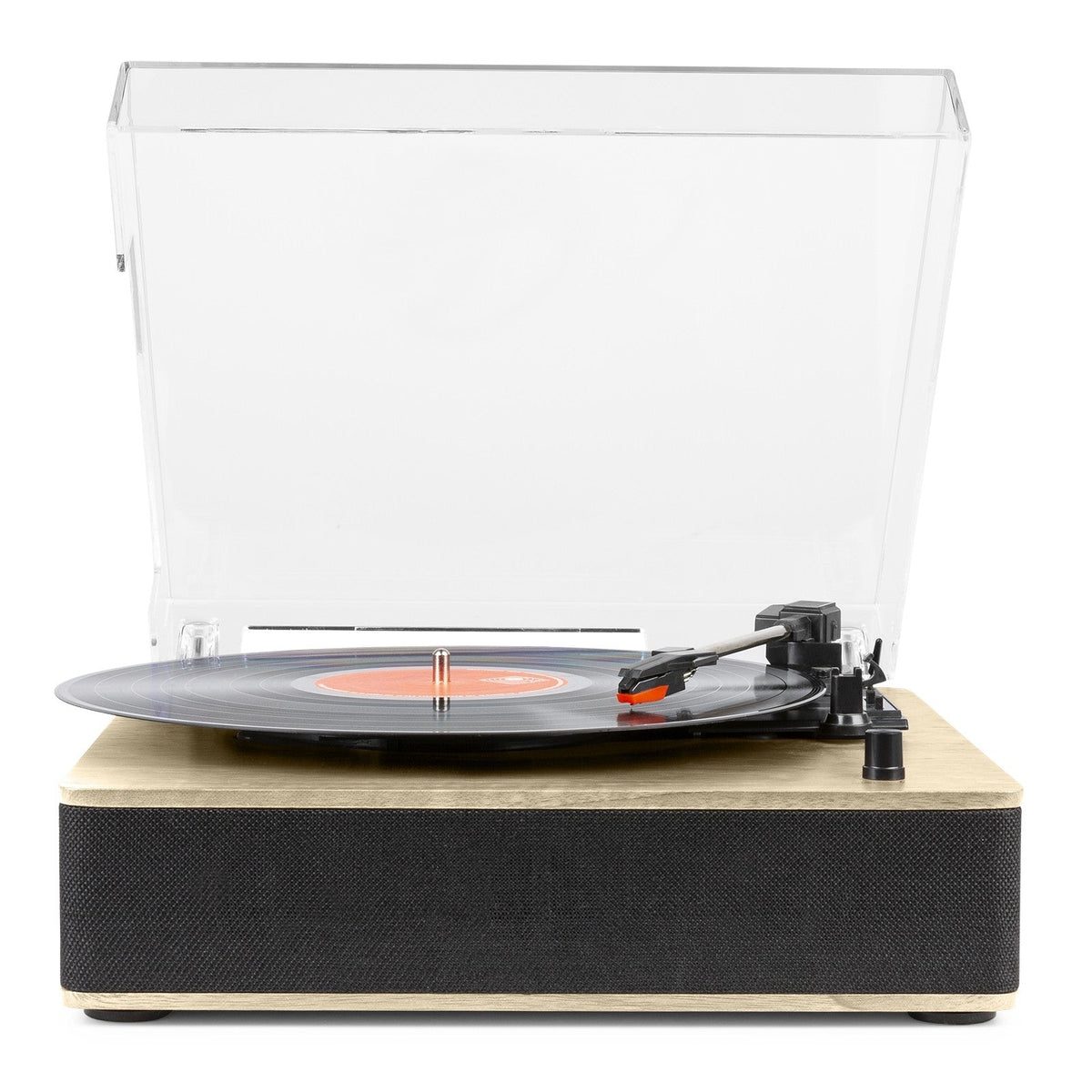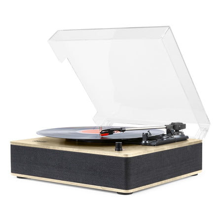 Tocadiscos de tracción por correa con sistema de altavoces estéreo integrados y receptor Bluetooth para streaming de audio. Chasis fabricado en madera con acabado claro y cubierta antipolvo transparente removible. El sistema soporta tres velocidades de reproducción (33 1/3, 45 y 78 RPM) y es compatible con discos de 7, 10 y 12 pulgadas. Incluye cápsula cerámica estéreo, función de parada automática (Auto Stop) y patas con tecnología de absorción de impactos. Conectividad física mediante salida de línea RCA estéreo para integración con sistemas de audio externos. Alimentación mediante adaptador de 5V.