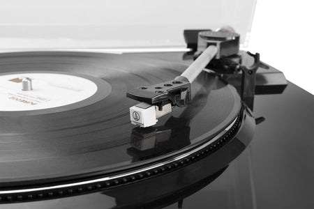 Giradiscos semi-automático de 2 velocidades (33 1/3 y 45 RPM) con tracción por correa. Equipado con un brazo metálico balanceado, una cápsula magnética de alto rendimiento Audio Technica 3600L y un preamplificador de fono integrado. Dispone de salidas de línea RCA y un puerto USB para digitalización de audio en un ordenador. El chasis está construido en ABS con acabado negro brillante, incluye una tapa antipolvo extraíble y patas de absorción de vibraciones. Dimensiones del producto: 398 x 359 x 91 mm. Peso: 2,7 kg.