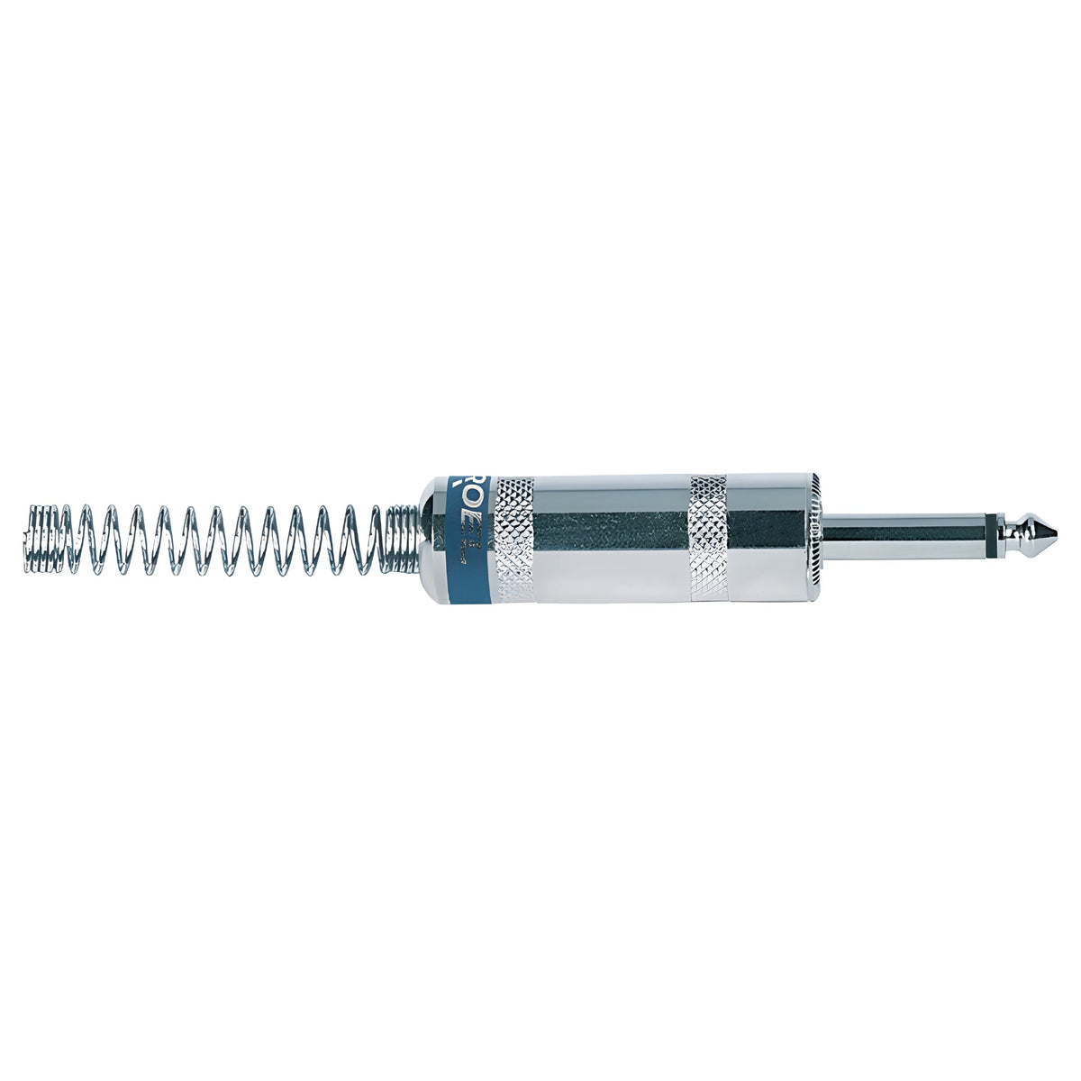 Conector aéreo Jack 6.3 mm (1/4") mono macho, serie profesional "Mini Jumbo". Construcción robusta con carcasa de latón niquelado y contactos niquelados. Incorpora sistema de protección contra tirones mediante muelle flexible de acero integrado. Diseñado para admitir cables de audio con diámetro exterior de hasta 9 mm. Formato recto TS (Tip-Sleeve) para terminación de cables desbalanceados de instrumento o altavoz.