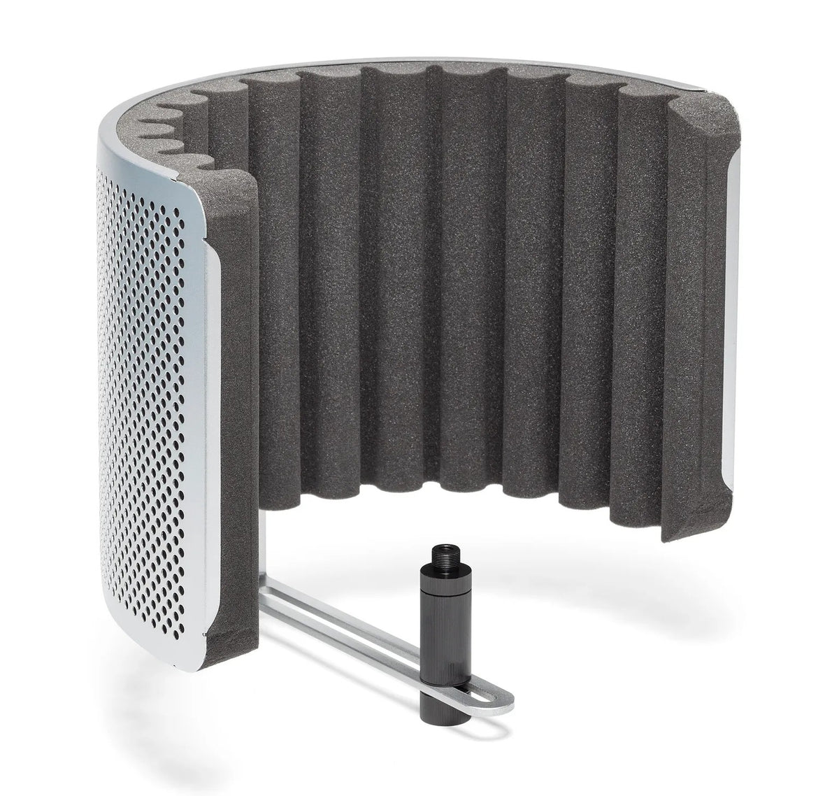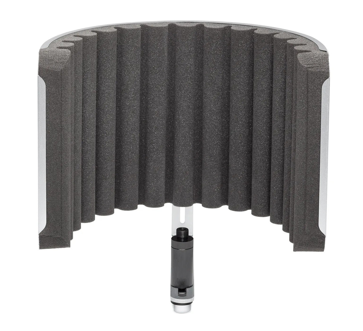 Filtro de reflexión acústica portátil de panel único con interior de espuma y marco de aluminio. Cobertura 254 × 356 × 229 mm (alto × ancho × fondo). Soporte de acero con recorrido vertical 165 mm y ajuste avance/retroceso 222 mm. Rosca 5/8"-27 para pinzas y pies de micrófono.