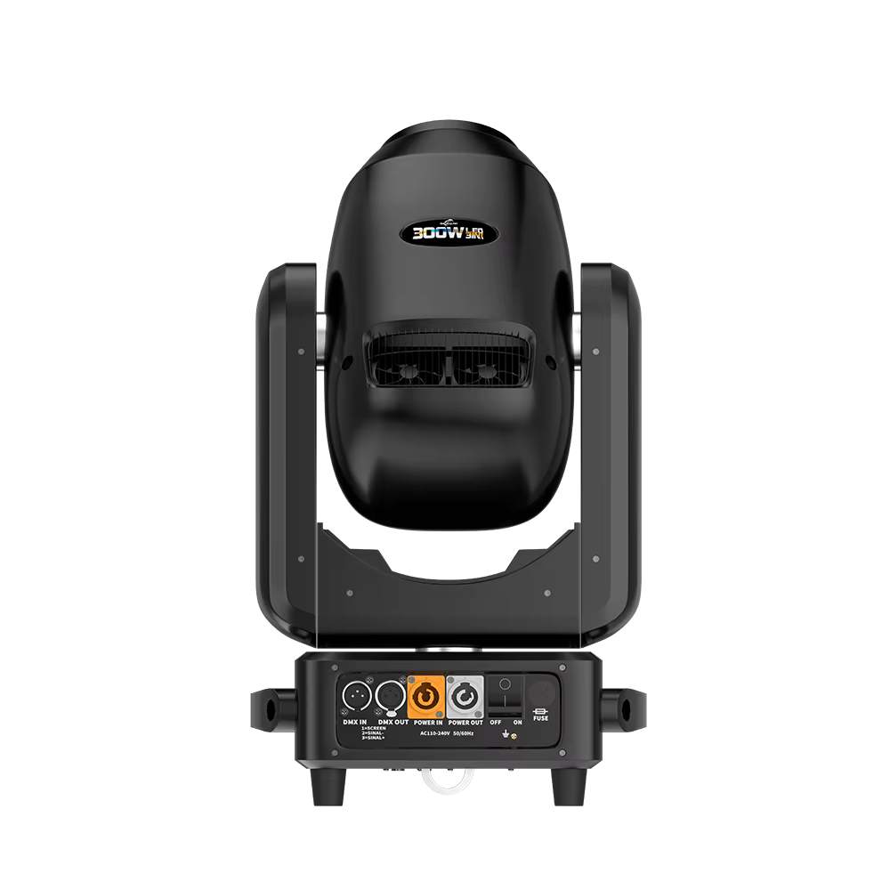 Fuente LED 300 W, temperatura de color 7000 K ± 500 K, ángulo de haz 3,5°–38° con frost, iluminancia 7 435 lux @ 10 m (3,5°) y 588 lux @ 10 m (38°), atenuación lineal 0 – 100 %, rueda de colores 9 filtros, doble rueda de gobos (6+7) con rotación, prisma 8 facetas, control DMX512/RDM (12/19 canales), alimentación 100–240 V/50–60 Hz, conector Neutrik PowerCON.