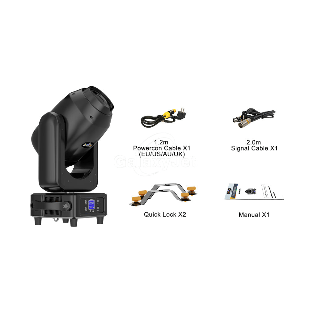 La cabeza móvil SHEHDS GalaxyJet LED 300W 3 en 1 combina en un único equipo las funciones de Beam, Spot y Wash, ofreciendo una solución integral para iluminar todo tipo de eventos y espectáculos. Gracias a su fuente LED de alta potencia de 300 W y su óptica de precisión, proyecta haces concentrados de 3,5° y amplios lavados de luz de hasta 38°, con una velocidad de atenuación lineal de 0 – 100 % para ajustes ultrafinos. Su temperatura de color de 7000 ± 500 K proporciona un blanco frío y brillante, ideal para resaltar detalles y colores vivos.