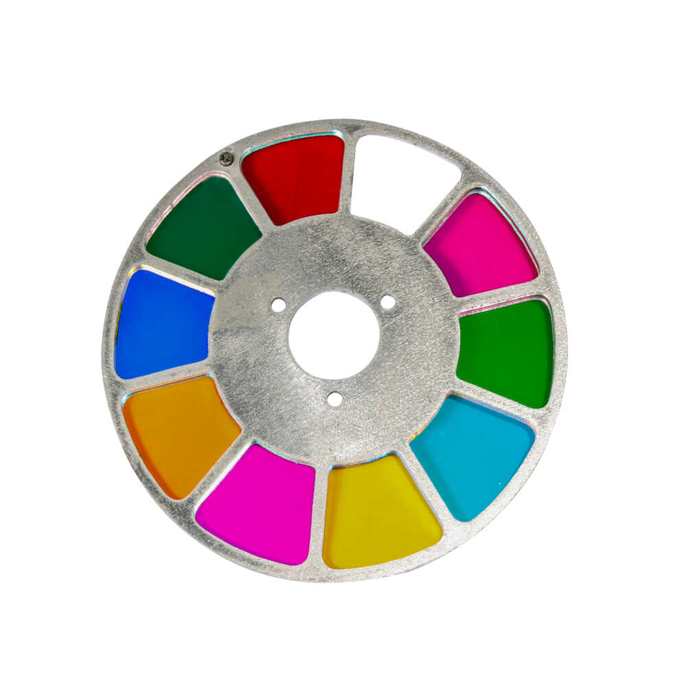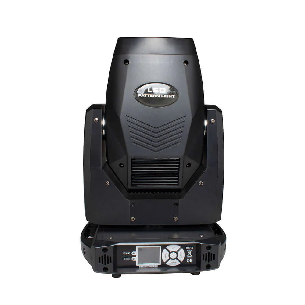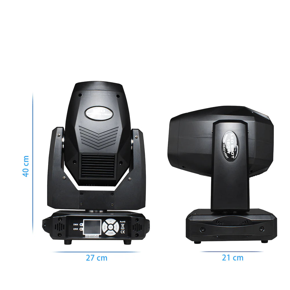 - Efectos dinámicos: gobo rotatorio (6 discos + abierto), color wheel (9 colores + abierto), prisma rotatorio de 6 caras, frost wash.
