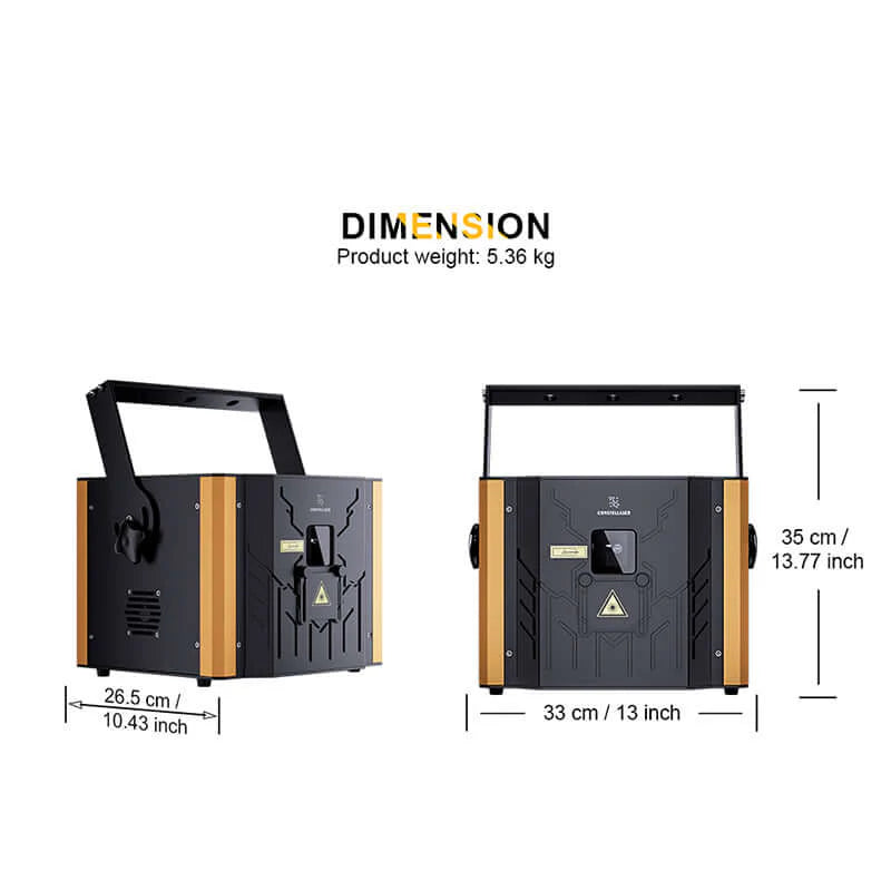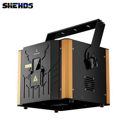El proyector láser SHEHDS NLA6WRGB “Constellaser” aporta un espectáculo visual de alta intensidad con 6 W de salida RGB (R 638 nm / G 520 nm / B 450 nm), combinando nitidez extrema y colores puros. Su sistema de escaneo galvanométrico a 25 kpps y ángulo de barrido de ± 50° permite generar patrones 3D/2D y animaciones fluidas mediante software, alcanzando hasta 50 m de proyección óptima y extendiéndose hasta 200 m en condiciones ideales.