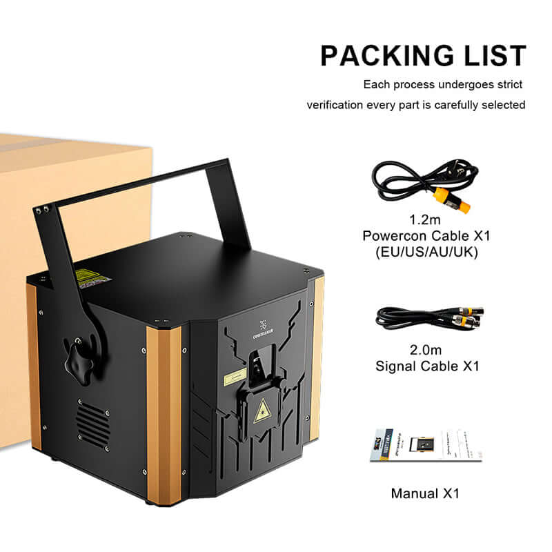 Controlable por APP móvil (iOS/Android), DMX512 (16/20 canales) o ILDA sobre RJ45, así como en modos maestro/esclavo, automático y sonido, ofrece total flexibilidad de programación. La modulación analógica 0–5 V o TTL (hasta 25 kHz) facilita efectos sincronizados con la música, mientras el chasis metálico de aluminio y la refrigeración por ventilador aseguran un funcionamiento fiable.