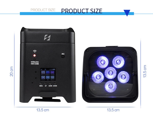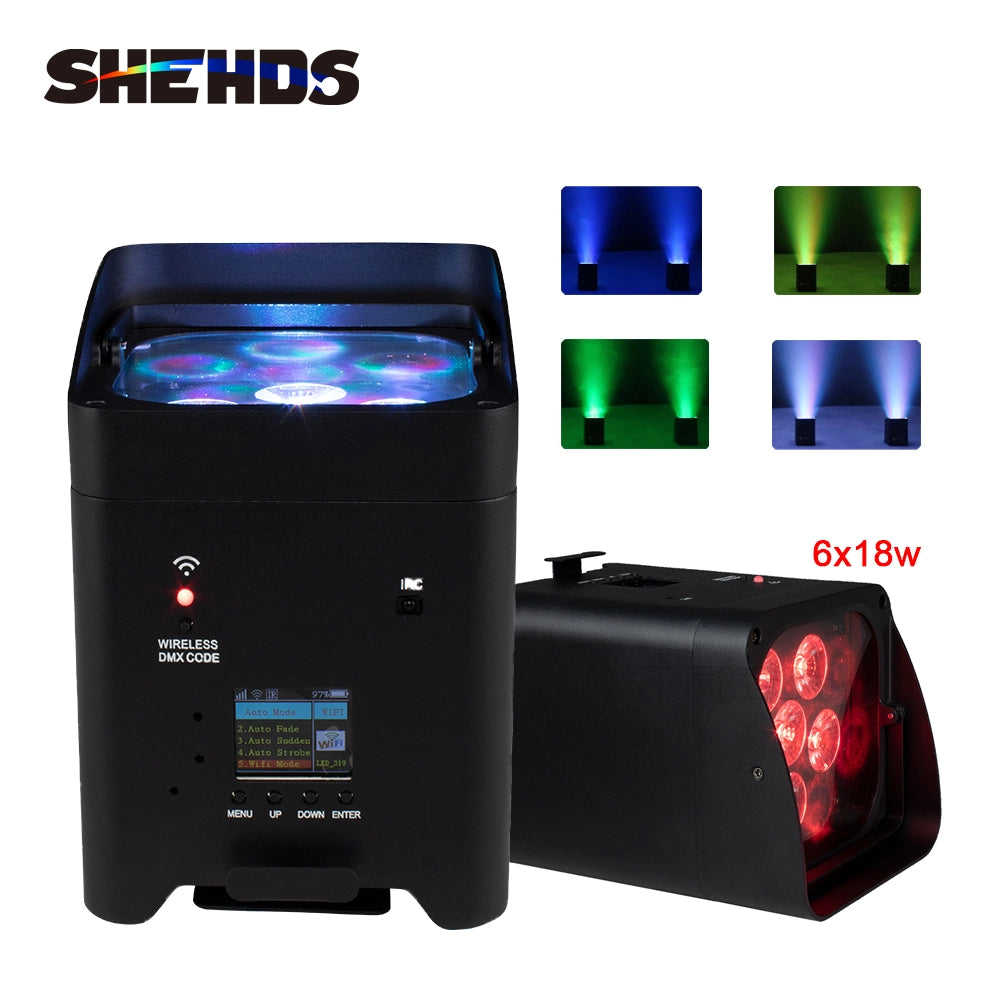 Foco PAR LED a batería SHEHDS 6×18 W RGBAW+UV, batería 8 800 mAh, WiFi & IR, DMX512 (6/10 CH), dimmer 0–100 %, estrobo 20 Hz, haz 40 °, IP44, tamaño 13,5×13,5×20 cm, peso 2,35 kg.