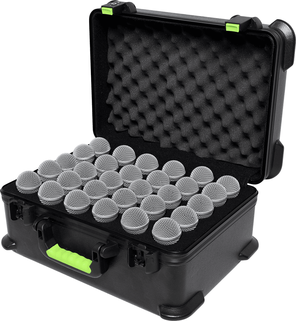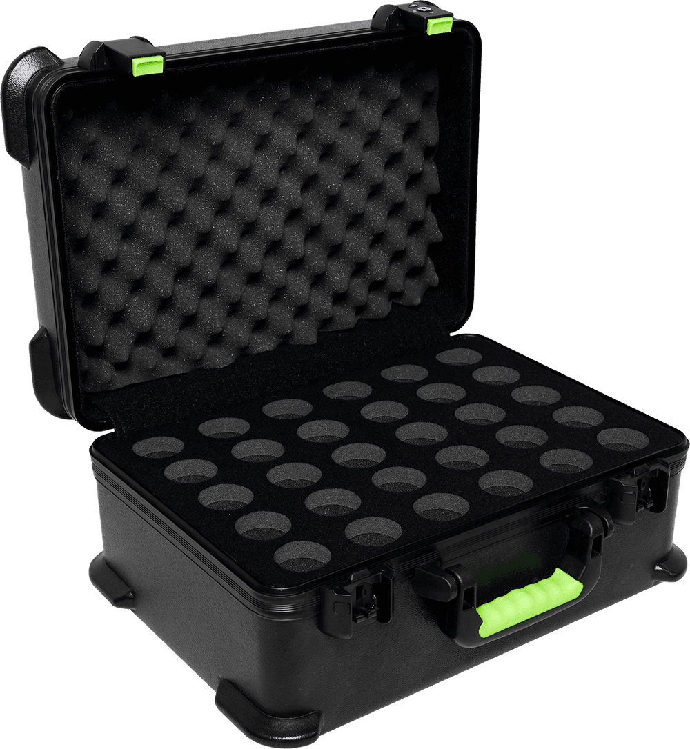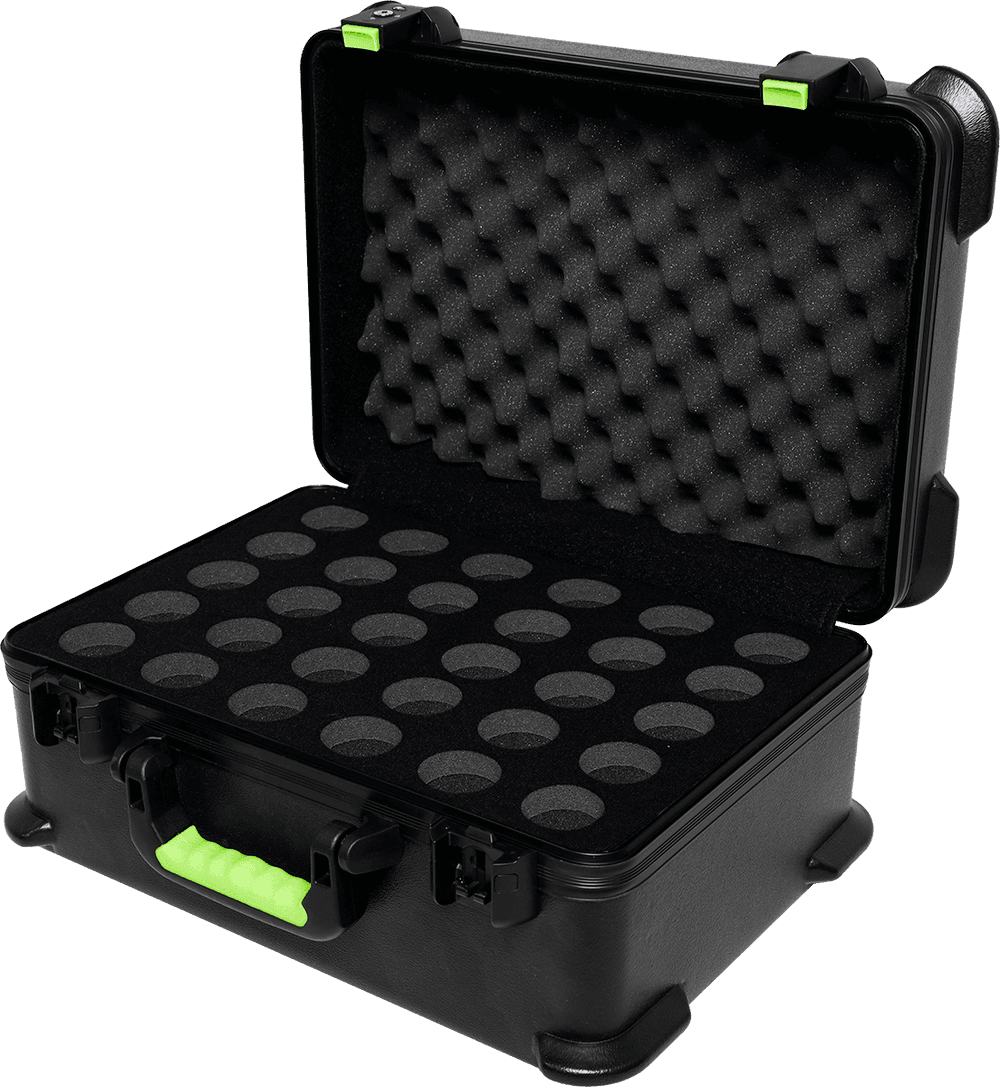 • Capacidad segura: hasta 30 micrófonos de mano con cable en alojamientos individuales de espuma.