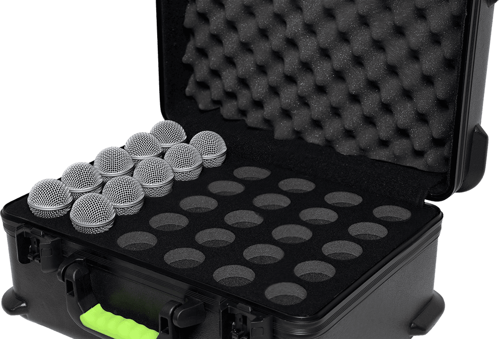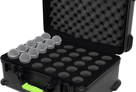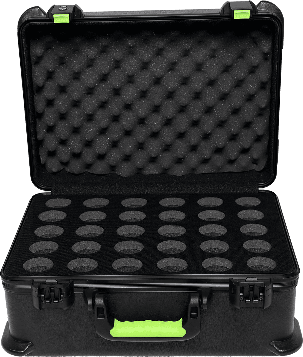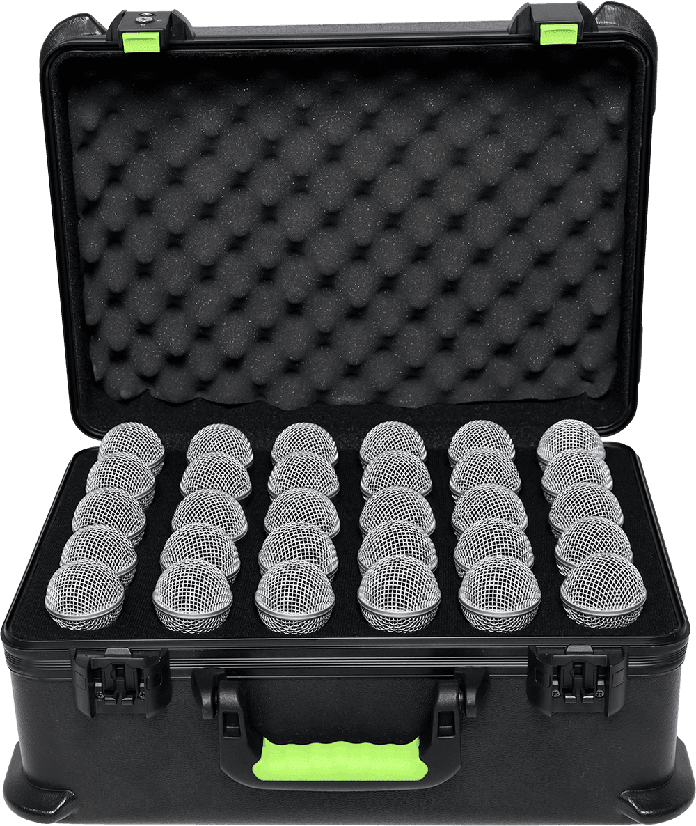 • Capacidad segura: hasta 30 micrófonos de mano con cable en alojamientos individuales de espuma.