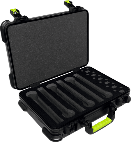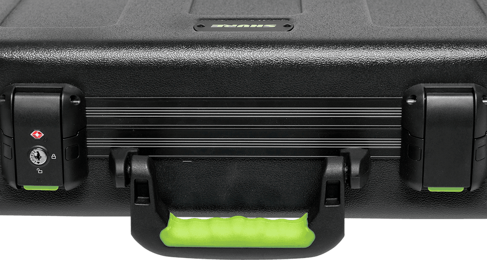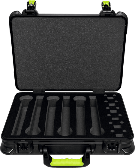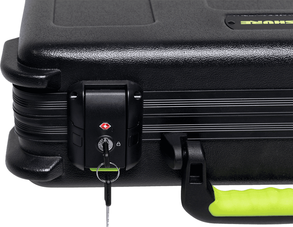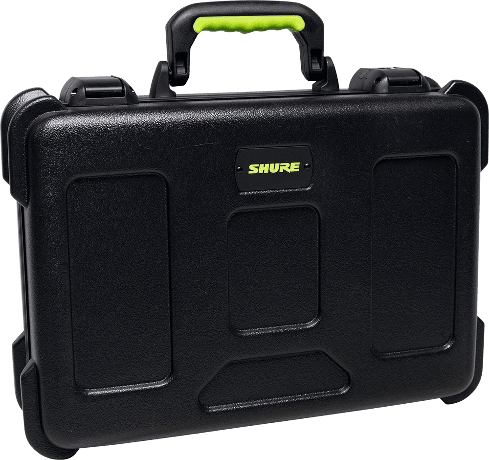 El Shure by Gator SH-MICCASEW06 es un estuche rígido moldeado y ligero, diseñado para transportar hasta 6 micrófonos inalámbricos (con batería instalada) con la máxima protección. Su carcasa de polietileno de alta resistencia soporta el uso intensivo en gira, alquiler y eventos, mientras que el cierre con bloqueo aceptado por la TSA lo hace idóneo para viajes en avión. El interior incorpora espuma protectora con “drops” o alojamientos dedicados para micrófonos y baterías, manteniendo cada unidad inmovilizada y ordenada. Cada alojamiento para micrófono mide 260 × 57 mm (L × Ø), y el conjunto se completa con asa Ergo-Grip moldeada por inyección para un agarre cómodo y duradero, además de herrajes y valona perimetral continua con recubrimiento negro en polvo para mayor longevidad. Dimensiones exteriores: 457 × 330 × 140 mm. Peso neto: 2,4 kg.