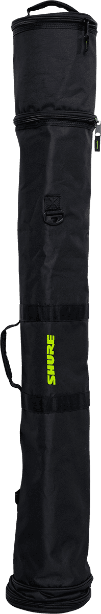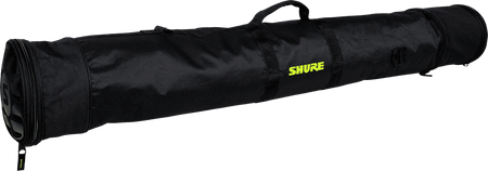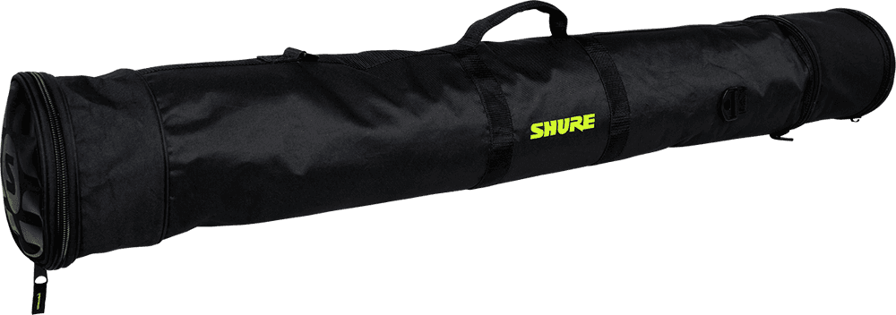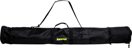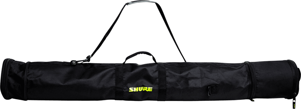 Bolsa acolchada para transporte de 3 soportes de micrófono y 5 micrófonos con compartimentos individuales, exterior en nylon 600D, bolsillo para cables, asa acolchada reforzada y correa de hombro ajustable. Dimensiones internas aprox.: 110 × 20 × 20 cm. Dimensiones externas aprox.: 112 × 25 × 20 cm. Peso aprox.: 1,8 kg. Fabricada por Gator bajo licencia de Shure. Modelo: SH-STANDBAG.