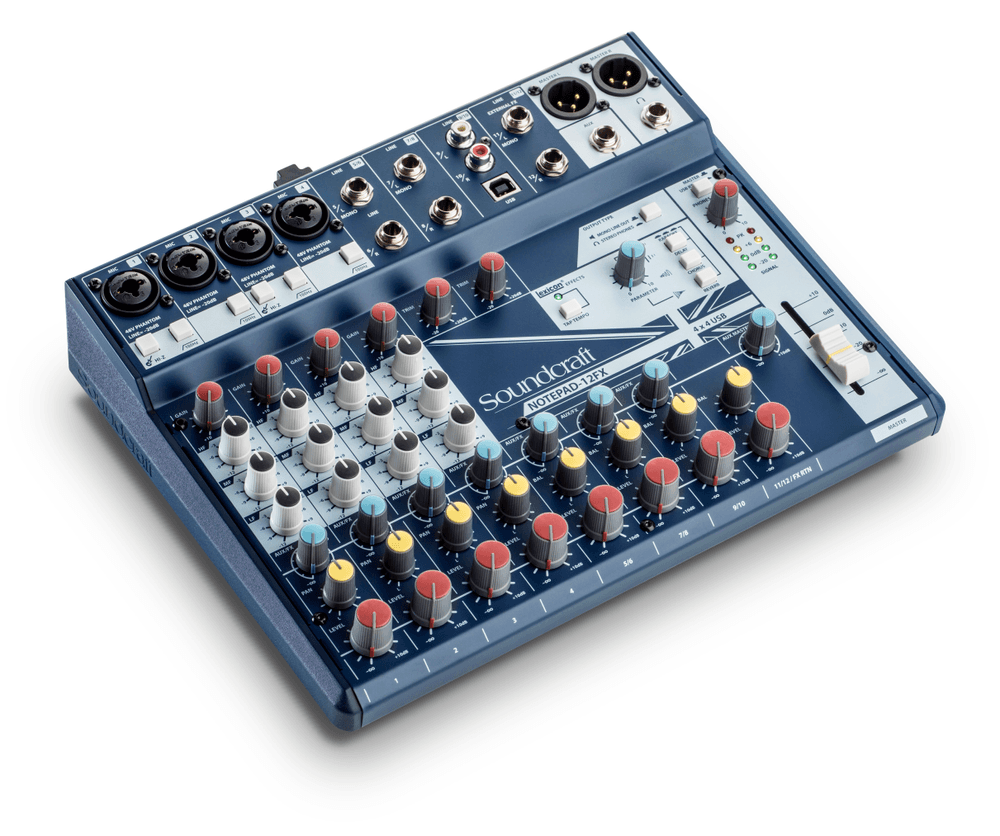 Consola Soundcraft Notepad-12FX de 12 canales con 4 preamps combo XLR/TRS, interfaz USB 4×4, efectos Lexicon®, EQ de 3 bandas, envíos FX y aux, salidas directas, ducking de auriculares y chasis metálico compacto.