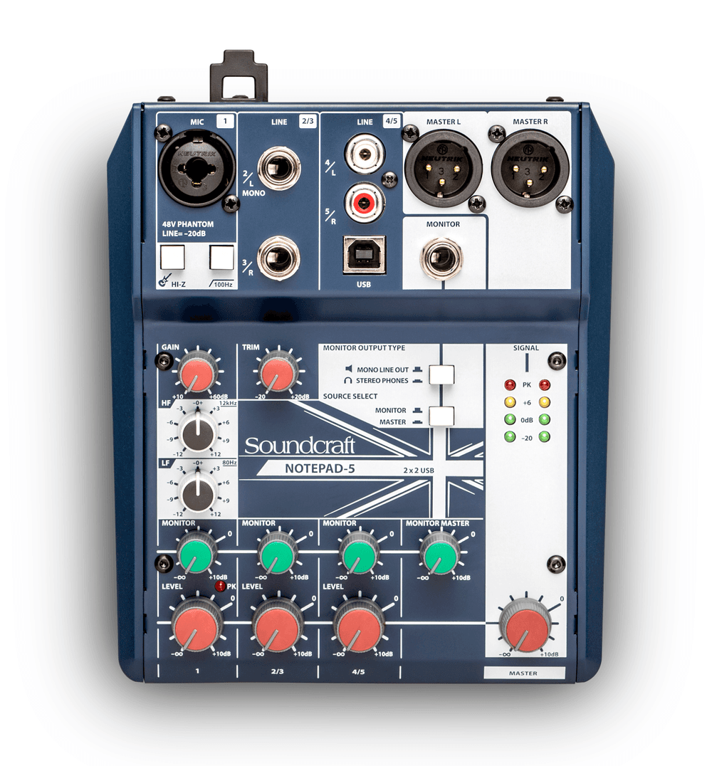 Consola Soundcraft Notepad-5 de 5 canales con 1 preamplificador XLR/¼″ mic/Hi-Z, 2 canales estéreo, E/S USB 2-in/2-out, EQ 2 bandas, filtro low-cut 100 Hz, envío de monitor dedicado, ducking automático, medidores LED, y chasis metálico robusto.