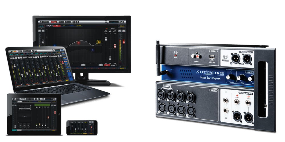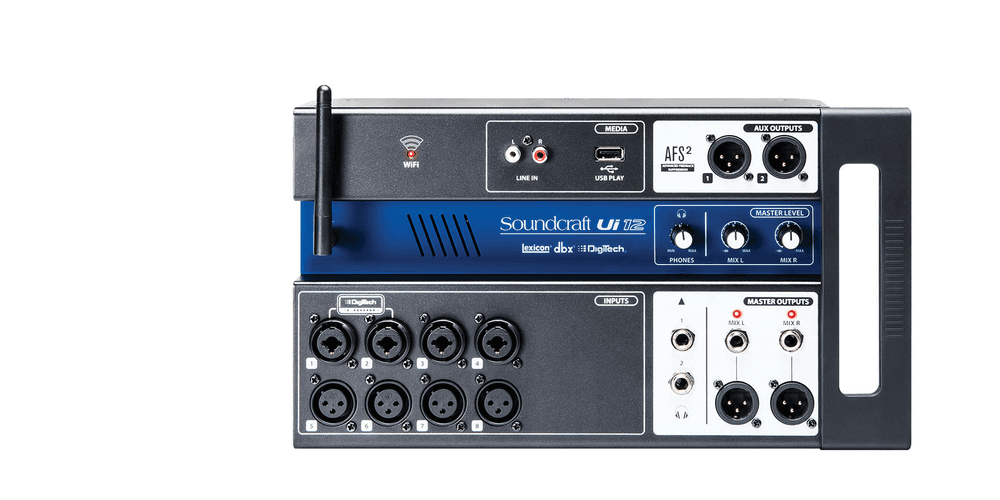 Mezclador digital Soundcraft Ui12 con Wi-Fi integrado, 12 canales de entrada (8 mic/line, 2 Hi-Z, 1 RCA, 1 USB media), preamplificadores recallables con phantom, DSP HARMAN (dbx AFS2, DigiTech, Lexicon), EQ de 4 bandas, 31-bandas gráfico, RTA, 3 Lexicon FX, subgrupos, snapshots, control desde 10 dispositivos simultáneos.