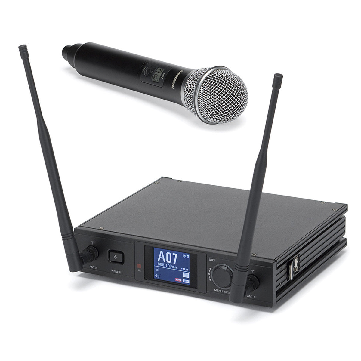 Transmisor de mano Samson UH7 para sistemas Synth 7 con cápsula dinámica Q8 (patrón supercardioide), pantalla LCD (canal/batería), sincronización IR con receptor UR7, RF 10 mW EIRP, autonomía hasta 15 h con 2×AA, rango operativo hasta 100 m, ganancia ajustable (rango 28 dB). Respuesta de audio del sistema: 50 Hz–15 kHz. Dimensiones aprox. 266 × 55 mm; peso ≈ 310 g. Uso exclusivo con receptores UR7 en la misma banda.