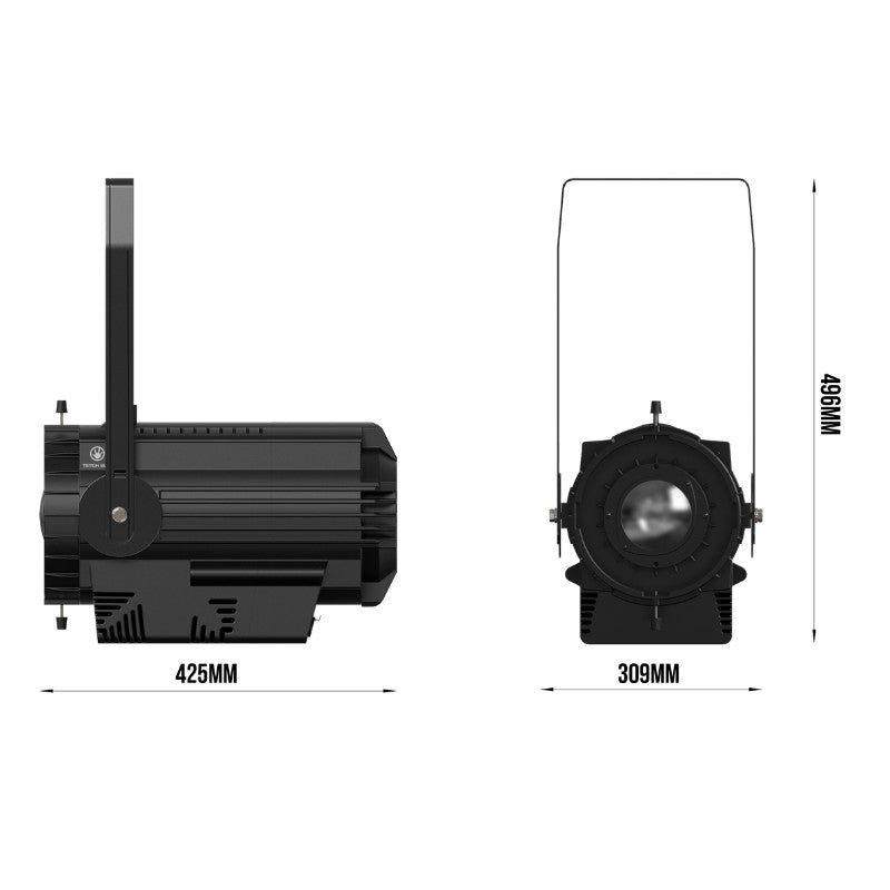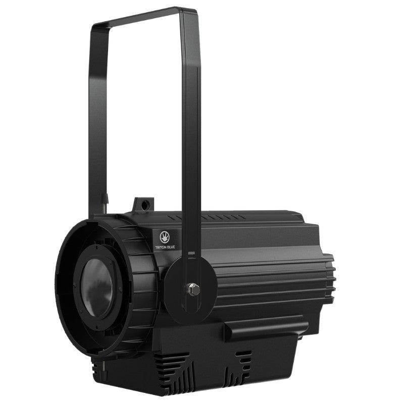 El Triton Blue T300-RGBAL es un motor LED COB de 300 W RGBAL (Rojo, Verde, Azul, Ámbar y Lima) diseñado como base de proyector de recorte para teatro, auditorios y alquiler profesional. Ofrece mezcla de color avanzada con control DMX-512 (modos de 5 o 9 canales), curvas de atenuación seleccionables (lineal, cuadrada, cuadrada inversa y en S) y pantalla LCD que agiliza la configuración. Su refrigeración extremadamente silenciosa con heat pipe permite usarlo en entornos sensibles al ruido. Se suministra sin óptica para que elijas la más adecuada (fijas 19º/26º/36º/50º o zoom 15º–30º y 25º–50º), y es compatible con ópticas ETC Source Four, además de admitir portagobos e iris para recortes precisos.