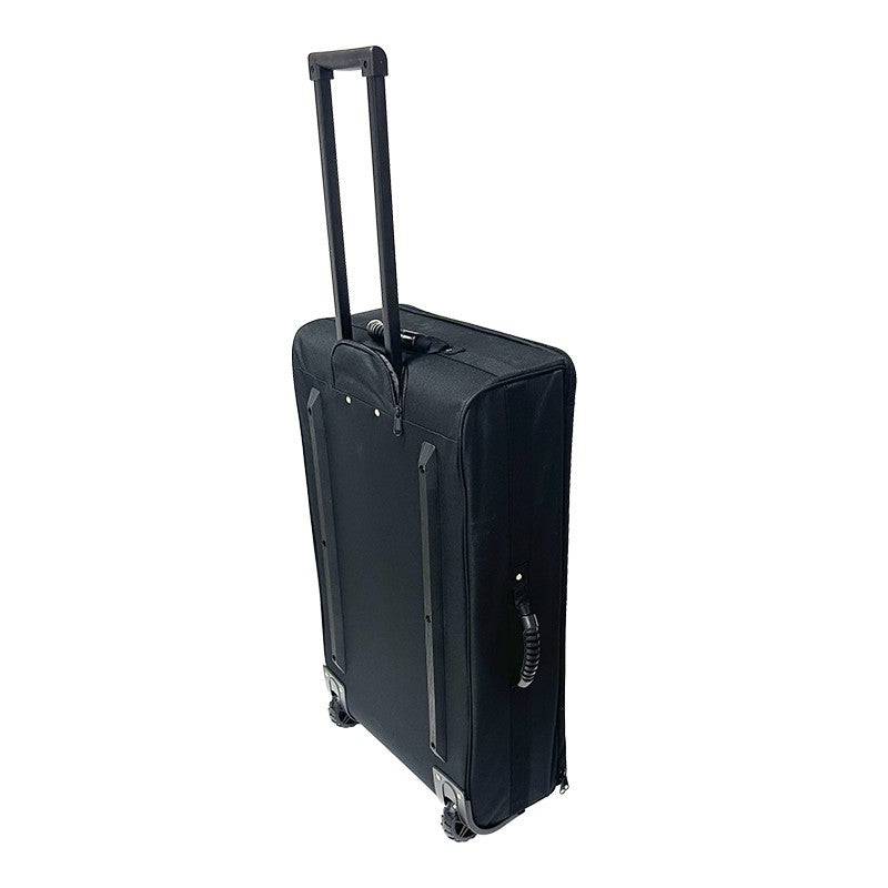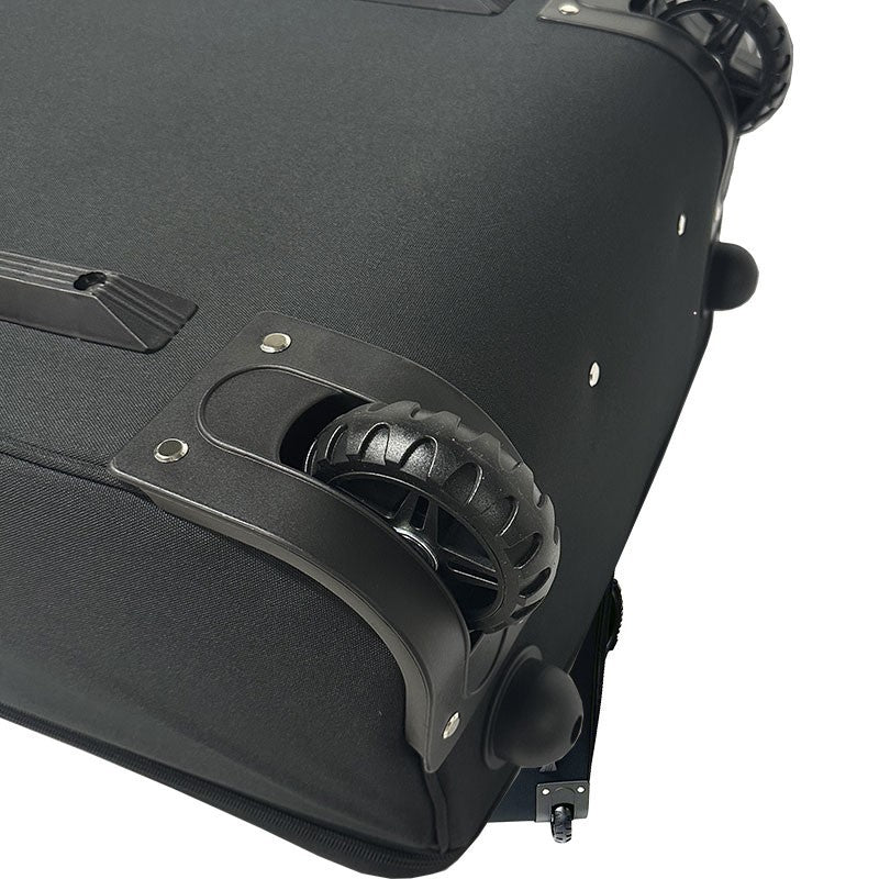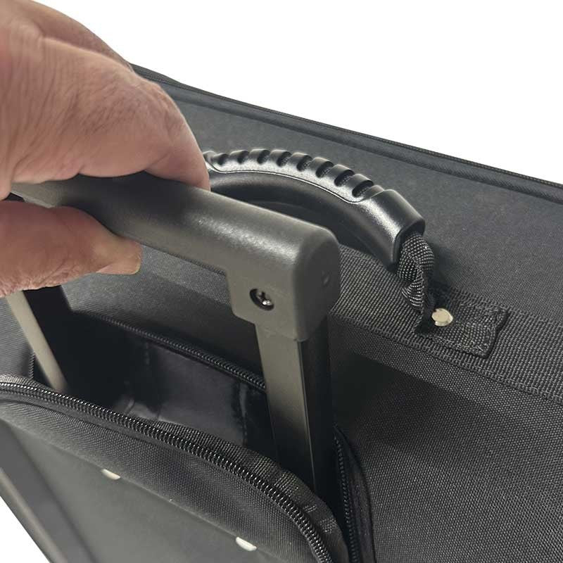 Fabricado con materiales de alta calidad, su exterior de poliéster negro no solo ofrece una apariencia profesional, sino que también es resistente al agua, protegiendo el contenido de la lluvia y las salpicaduras. El interior está completamente forrado con un material suave y un generoso acolchado de espuma de 5 mm, que absorbe los impactos y previene arañazos durante el transporte. La movilidad es uno de sus puntos fuertes, gracias a sus dos ruedas de alta resistencia y a un tirador telescópico que se oculta completamente en el cuerpo de la maleta cuando no está en uso, optimizando el espacio y evitando enganches.