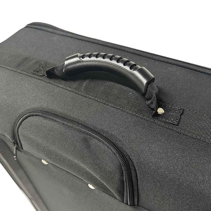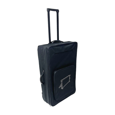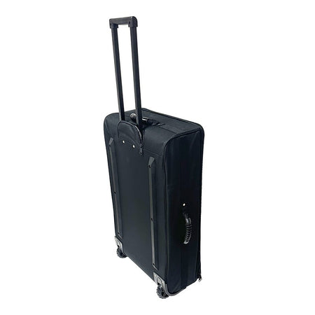 Trolley de transporte fabricado en poliéster negro resistente al agua con interior forrado y acolchado con espuma de 5 mm. Equipado con un sistema de 6 separadores internos personalizables (410 x 120 mm) mediante velcro. Dispone de 2 bolsillos interiores y 2 exteriores con cierre de cremallera. El sistema de transporte se compone de 2 ruedas de alta resistencia, un tirador telescópico ocultable y un asa superior acolchada. Dimensiones interiores: 750 x 420 mm. Dimensiones exteriores: 460 x 220 x 860 mm. Peso del producto: 3,0 kg.