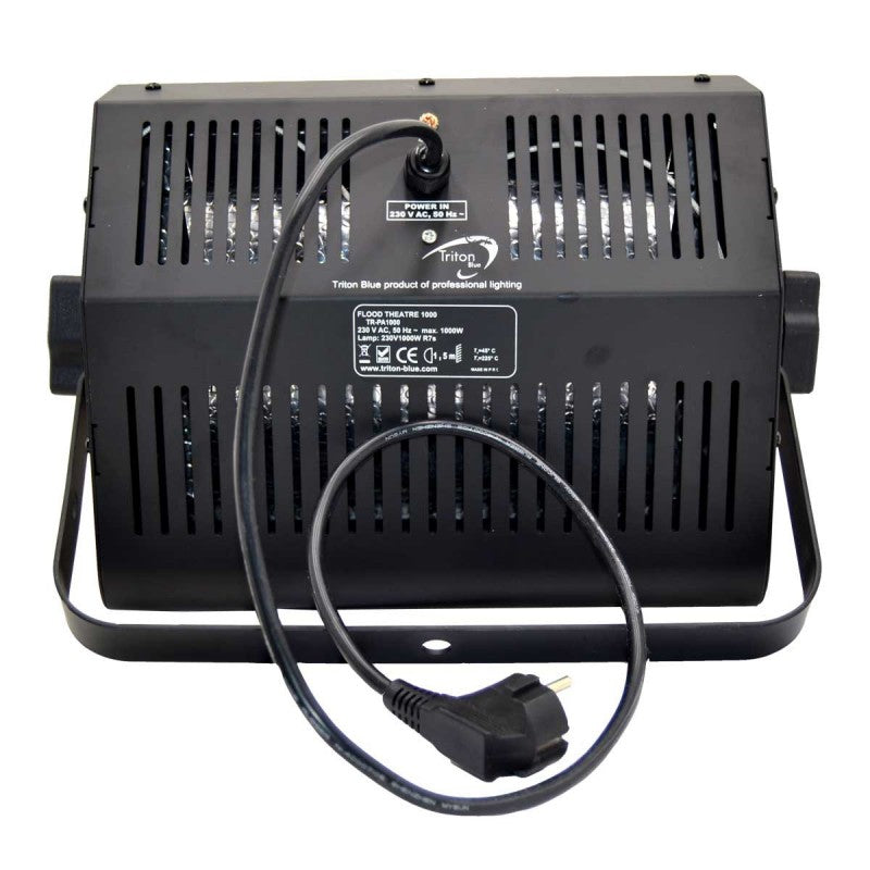 - Proyector tipo panorama con reflector simétrico, Triton Blue modelo TR-PA1000, con porta lámparas R7S, para lámpara lineal halógena de doble casquillo de 1000W/230V, (Rs 7 189 mm). Fabricado en aluminio extrusionado, pintado en pintura epoxi negro, con rejilla de protección y cristal temporizado de seguridad. Lira de acero con pomo de fijación y ajuste en cualquier posición, cable de alimentación con pasa cables y resistente al calor de 3x1,5 mm2 y clavija aérea de goma tipo Schuko de 16A+TT.