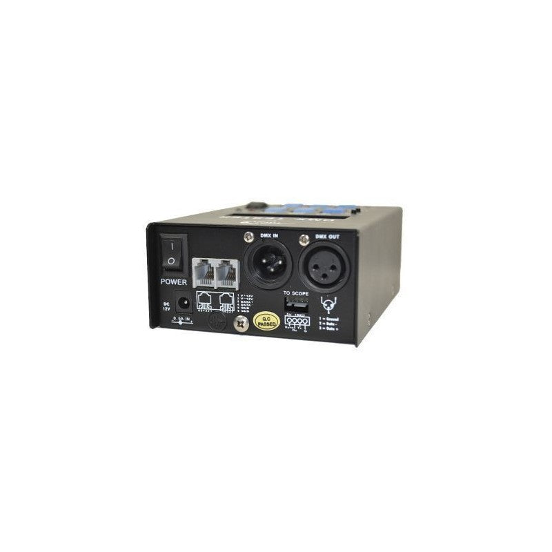 Tester DMX 512 portátil con pantalla LCD y lectura decimal/hexadecimal/porcentaje. Prueba de formato de datos y sincronización entre entrada y salida DMX. Conectividad: XLR 3 pines IN/OUT, RJ11 y conector de sincronismo. Alimentación por batería recargable o adaptador 12 V DC. Autonomía: hasta 3 h en uso continuo o 100 h en espera, con standby automático a los 5 min. Dimensiones 100 × 50 × 133 mm; peso 0,75 kg.