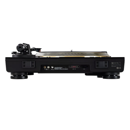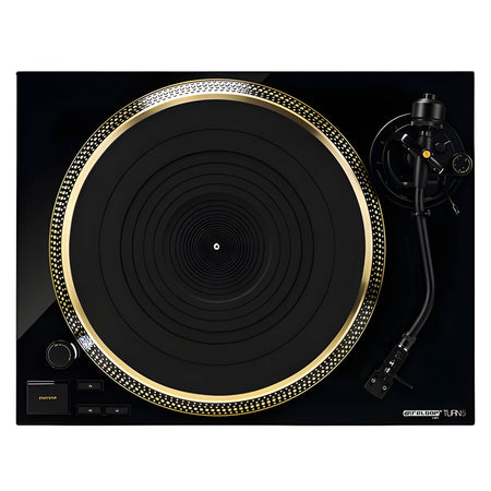 El Reloop TURN 5 es un tocadiscos Hi-Fi de tracción directa diseñado para ofrecer estabilidad de giro y un sonido refinado en sistemas audiófilos. Su motor DC sin escobillas con control por cuarzo mantiene una rotación precisa en 33 1/3, 45 y 78 RPM mediante selección electrónica, mientras que el plato de aluminio a presión con revestimiento amortiguante y alfombrilla de goma de 5 mm reduce resonancias no deseadas. El plato anodizado en oro y el acabado negro piano aportan una estética atemporal.