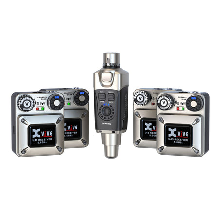 El kit XVIVE U45R4 incluye un emisor U45T y cuatro receptores U45R4 para monitorización in-ear profesional en banda de 5,8 GHz con tecnología True Diversity. Ofrece audio digital sin comprimir de 24 bit/48 kHz, latencia inferior a 5 ms y una respuesta de frecuencia completa de 20 Hz – 20 kHz, garantizando señal nítida y sincronizada en directo. El sistema escanea automáticamente seis canales RF y selecciona el óptimo para evitar interferencias, con alcance de hasta 30 m en línea de vista. Tanto el emisor como los receptores son recargables (aprox. 5 h de autonomía) y están alojados en carcasas ABS ligeras (90 g emisor, 118 g receptor), con conmutador Aux/Line y salida minijack estéreo para conectar auriculares o IEMs.