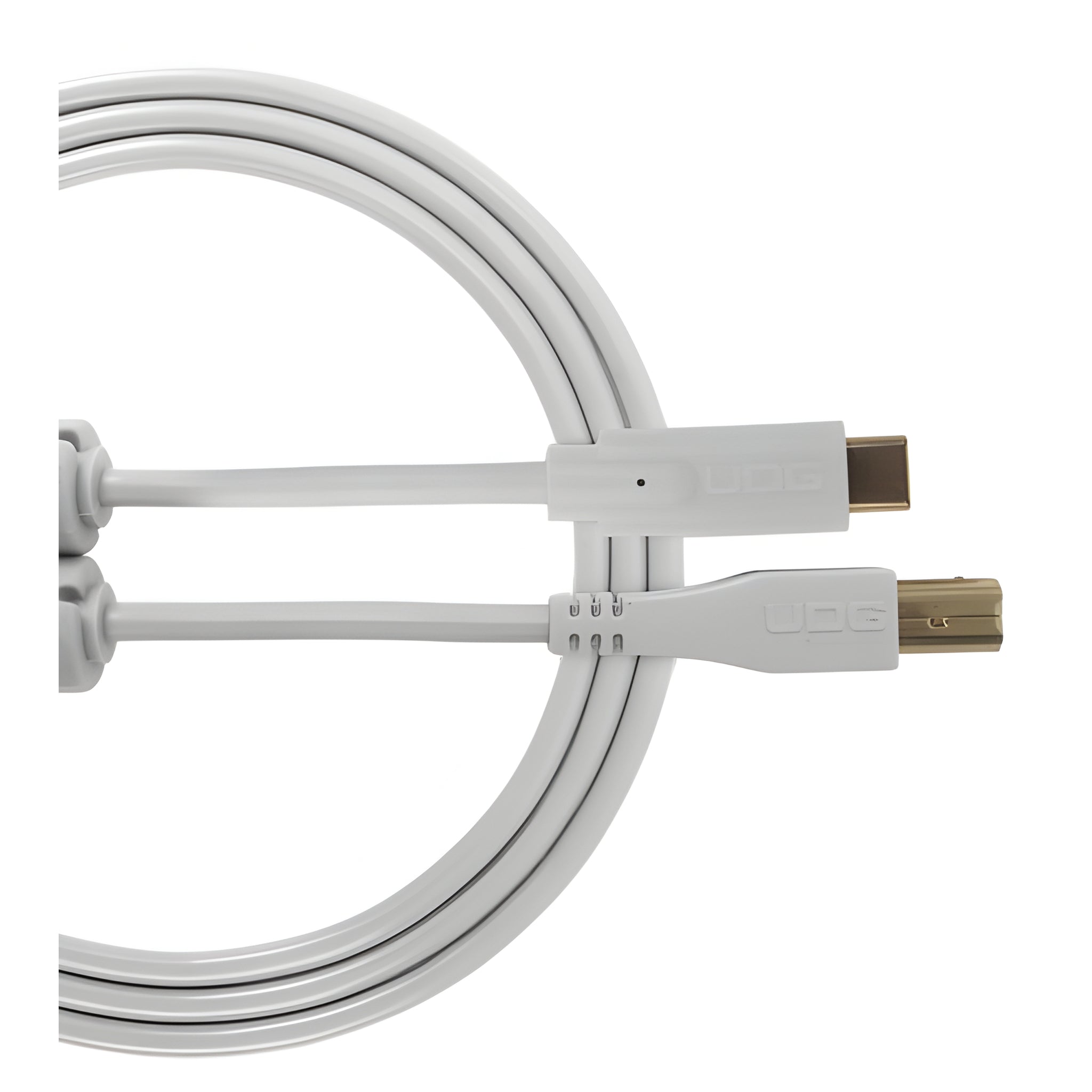 Cable USB 2.0 USB-C (m) a USB-B (m), diseño recto, 1,5 m, color blanco; PVC multiapantallado; conectores dorados; dos núcleos de ferrita; incluye cinta de velcro UDG; peso aprox. 0,10 kg; uso recomendado: conexión host USB-C a dispositivos USB-B para audio profesional.
