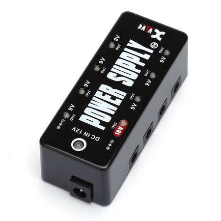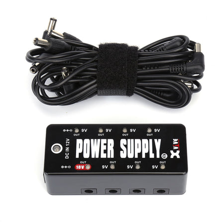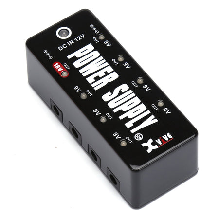 El XVIVE V19 Micro Power Supply es una fuente de alimentación compacta y robusta para pedalboards que ofrece ocho salidas independientes: siete de 9 V DC hasta 300 mA cada una y una de 18 V DC a 150 mA. Su carcasa metálica ahorra espacio y se integra bajo cualquier pedalera sin estorbar. Cada salida dispone de protección contra cortocircuitos y led de estado individual, de modo que un fallo en un canal no afecta al resto. Incluye adaptador de 12 V DC (2 A) y cables para todos los conectores.