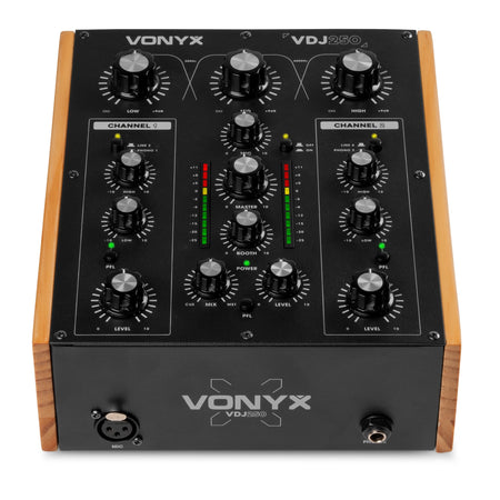 Experimente el arte y la fluidez de la mezcla analógica con el Vonyx VDJ250, un mezclador rotativo de dos canales diseñado para DJs que valoran el control táctil, preciso y suave de los potenciómetros giratorios. Este mezclador recupera la esencia de la mezcla clásica, ofreciendo un sonido excepcionalmente cálido y dinámico con un inconfundible toque vintage. Es la pieza central perfecta tanto para configuraciones tradicionales con vinilos como para sistemas digitales modernos, uniendo lo mejor de ambos mundos.