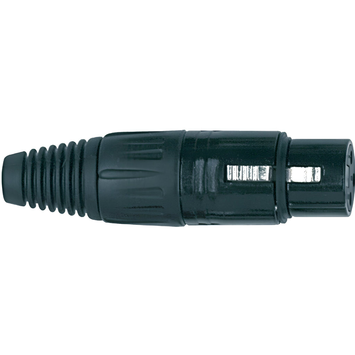 Conector XLR aéreo hembra de 3 polos serie profesional para montaje en cable mediante soldadura. El cuerpo del conector está fabricado en metal con un acabado niquelado de color negro mate antirreflejos. Incorpora un sistema de retención de cable interno mediante pinza de nylon para asegurar la tracción mecánica y un resorte terminal de PVC para alivio de tensión por flexión. Compatible con cables de audio balanceado y señal de control estándar. Diseño ergonómico y desmontable para facilitar el mantenimiento en campo.