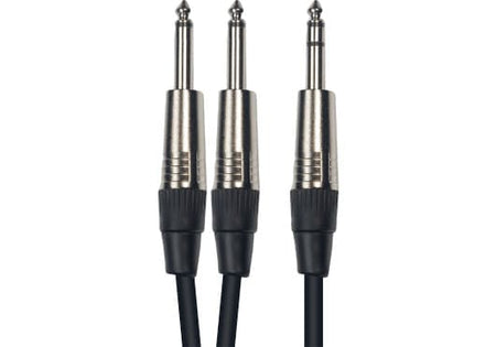 Cable en Y de audio: 2 × jack 6,35 mm TS macho a 1 × jack 6,35 mm TRS macho; longitud 6 m; apantallado en espiral de cobre desnudo; cubierta de PVC negro; diámetro exterior 8 mm; aplicación: insert/derivación estéreo.