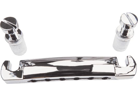 Cordal metálico tipo Stopbar (Stop Tailpiece) para guitarra eléctrica. Acabado cromado de alta resistencia. Diseñado para guitarras de cuerpo sólido tipo Les Paul, SG y similares. Fabricado en aleación de zinc fundido a presión. El conjunto incluye la barra de anclaje de cuerdas y dos pernos de montaje (studs) con rosca métrica y casquillos de inserción para el cuerpo. Espaciado estándar compatible con la mayoría de instrumentos de importación.