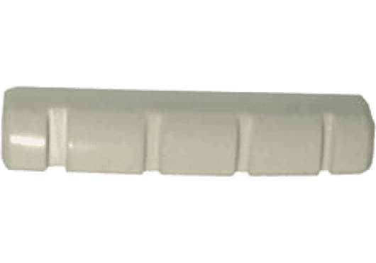 Cejuela de reemplazo para bajo eléctrico de 4 cuerdas fabricada en material sintético de alta resistencia color blanco. Dimensiones estándar de 1-11/16" (42.86 mm) de ancho, 3/8" (9.5 mm) de altura y 1/4" (6.35 mm) de grosor. Diseño pre-ranurado para facilitar la instalación y ajuste de espaciado de cuerdas. Ideal para reparaciones y mantenimiento de instrumentos estándar.