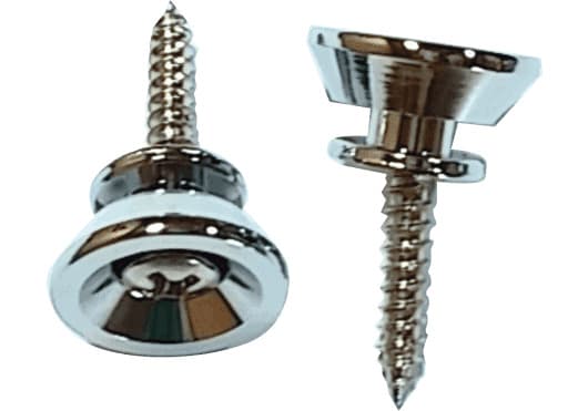 Juego de dos botones de sujeción para correa de instrumento musical, modelo ADIEZ2396C de la marca Yellow Parts. Fabricados en metal con acabado cromado brillante de alta resistencia a la corrosión. Diseño técnico "Tipo LP" con brida superior ensanchada para optimizar la retención de la correa. Incluye dos unidades para instalación en posición de mástil y cuerpo. Compatibles con la mayoría de guitarras eléctricas y bajos del mercado mediante fijación por tornillo.